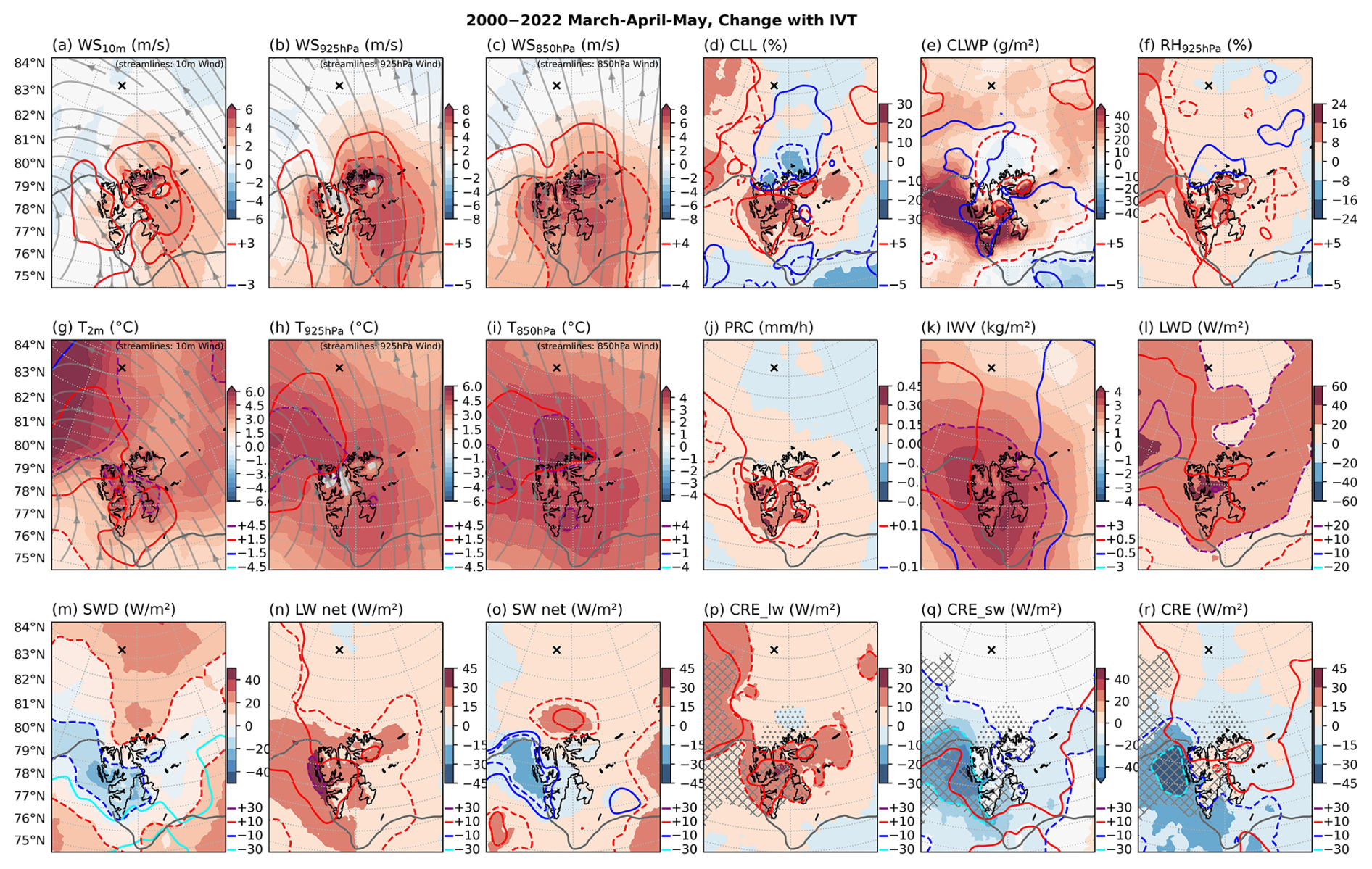 To generalize the insights gained from the April 2020 case study in a climatological context, we now analyze springtime periods with southerly advection over Svalbard during 2000–2022 in 𝙸𝙲𝙾𝙽𝚌𝚕𝚒𝚖 (Sect. 2.2). For March–April–May 2000–2022, we identified 737 and 821 hourly time steps where the mean moisture transport (IVTSv) or wind speed (WS850 hPa,Sv) over Svalbard, respectively, was in the upper quartile and from southerly direction (165–195°). For 380 time steps, these conditions were simultaneously met. Composite mean fields for these subsets are shown in Fig. 11. We refer to the 25th–50th percentile and 75th–100th percentile of IVTSv (27.8–48.2 and > 79.4 kg m−1 s−1) or WS850 hPa,Sv (5.5–7.8 and > 10.8 m s−1) as “low” and “high” IVT or wind speed. IVTSv and WS850 hPa,Sv are correlated and their mean values increase between the 25th–50th and 75th–100th percentile of the other respective quantity (45.3 to 93.1 kg m−1 s−1 and 7.4 to 12.6 m s−1).