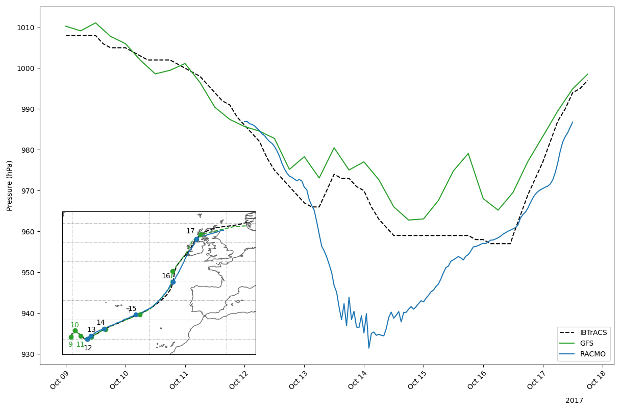 Figure 3Minimum central pressure profile of Hurricane Ophelia for the RACMO 0 °C simulation initialized 12 October 2017 00:00 UTC (blue) compared to the GFS simulation (green) and the IBTrACS observations (black). Inset figure shows the associated tracks with daily storm locations.