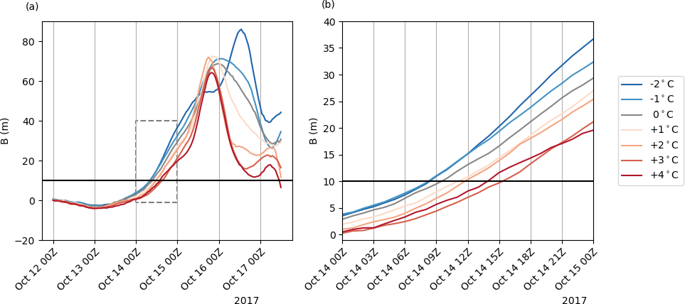 Based on the temporal evolution of the thermal asymmetry parameter B (see Fig. 5 and the definition in Evans and Hart, 2003), we can pinpoint when Ophelia's ETT starts in each of the alternate climate scenarios. In each scenario, B initially remains well below the ETT threshold value of 10 m, as expected for a symmetric TC. All of the simulations cross the ETT threshold (starting their ETT) between 8–16:00 UTC on 14 October (Fig. 5b). In general, the scenarios with lower temperature forcing start ETT earlier than the scenarios with higher temperature forcing, but there is some fluctuation, with the +4 °C simulation leading the +3 °C, and the −2 and −1 °C simulations starting their ETTs at nearly the same time.