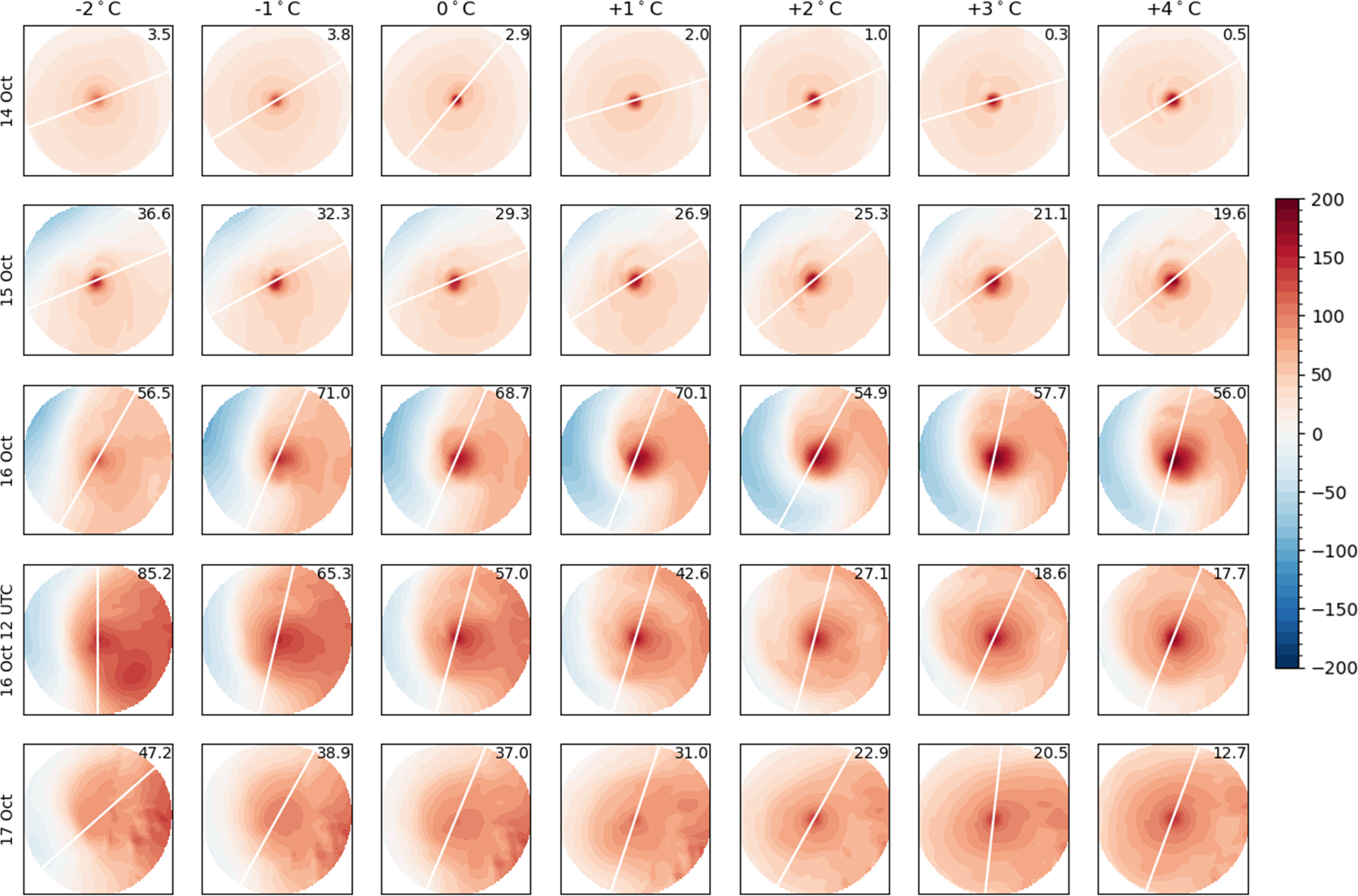 All simulations except the −2 °C have a peak in asymmetry at the end of 15 October, after which their asymmetry decreases again. The three warmest simulations very quickly attain low levels of asymmetry and return to near-TC levels. These results are indicative of an “instant warm seclusion”, a term coined by Sarro and Evans (2022), to describe a storm that immediately attains a storm structure similar to that of a warm seclusion cyclone but without going through the cold-core structure typical of that pathway. As the warmer scenarios return to TC-like faster and with less asymmetry than the cooler simulations, this implies that Ophelia maintains more of its TC-like characteristics in the warmer scenarios. This progression can also be seen in Fig. 6: while all scenarios undergo the transition from radially symmetric TC on 14 October to asymmetrical on 16 October, we see that by 16 October 12:00 UTC the storms in the warmest scenarios return to the radially symmetric structure more than the cooler simulations.