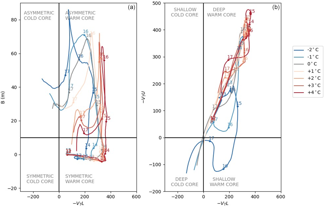We can put this progression of ETT in more context by looking at the full CPS diagrams for Ophelia (see Fig. 7a). The simulations with higher temperature forcing have a higher than the simulations with lower forcing, indicating they have stronger warm cores in the lower troposphere. This is to be expected with the ΔT we introduced, as the higher SSTs mean more available latent heat, and thus more warming in the atmosphere due to latent heat release. The +2, +3, and +4 °C temperature forcing maintain their after reaching peak asymmetry and only starts decreasing substantially on 16 October, with warmer simulations starting this later than cooler simulations. In contrast, simulations with +1 °C or less temperature forcing start decreasing their before or at peak asymmetry.