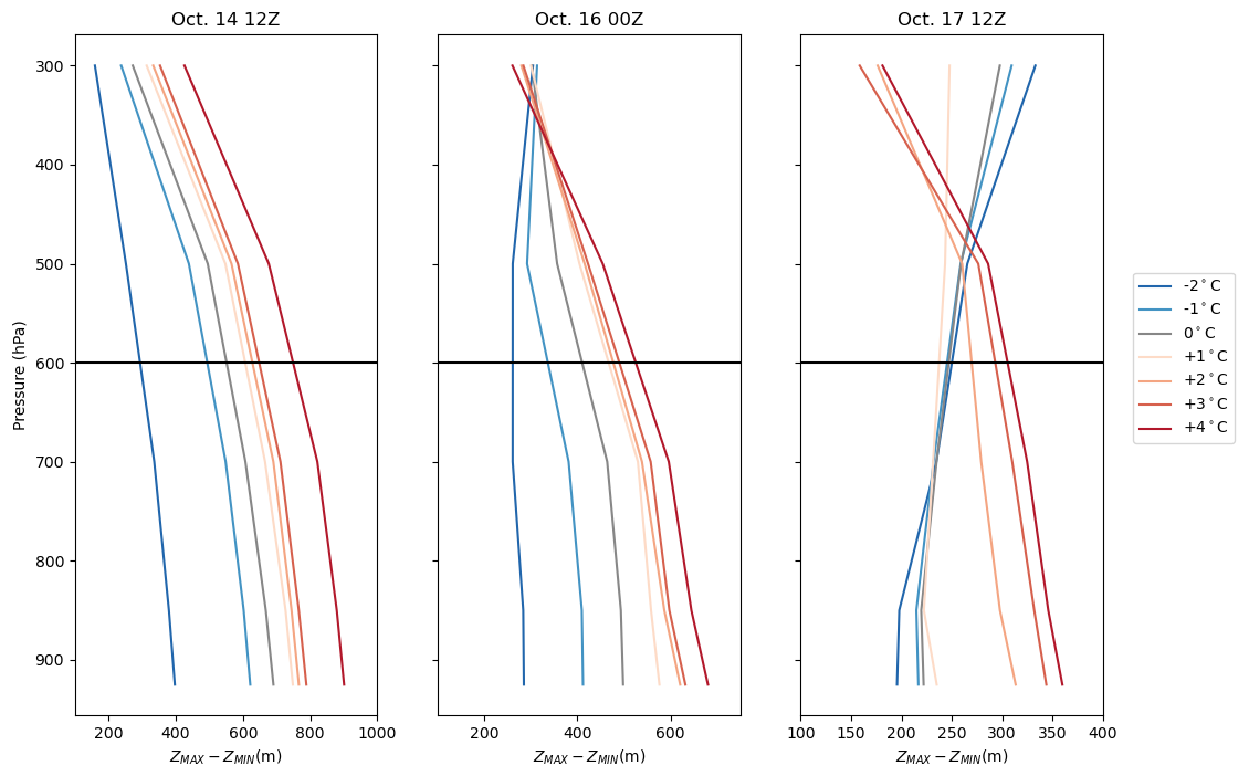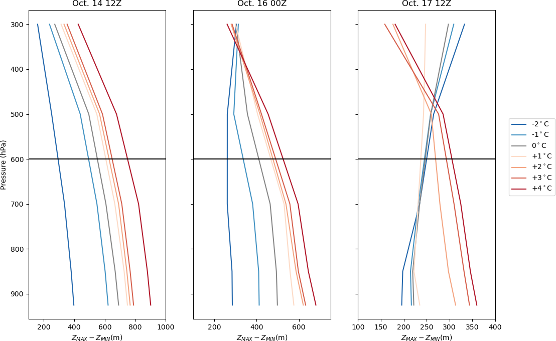 At the approximate start of the ETT (Fig. 8, left panel) Ophelia is still a warm-core storm in all scenarios, as the profiles of the storm show decreasing ZMAX−ZMIN with height, specifically for pressure levels under 600 hPa. We also see a clear ordering of ZMAX−ZMIN magnitude, with warmer simulations showing strictly greater ZMAX−ZMIN values than colder simulations.