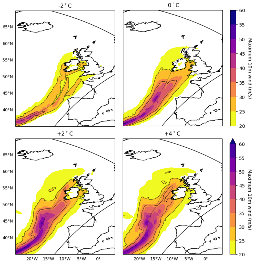 Interestingly, although the track moves westward with warmer scenarios, the winds experienced around Ireland are stronger than in the scenarios where the storm hits the country directly (Fig. 9). This is predominantly caused by the combination of Ophelia becoming more powerful and its wind field expanding in the warmer runs compared to the control run.