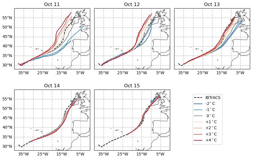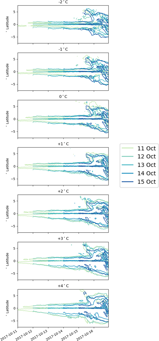 The tracks of the 11 and 13 October simulations follow the same pattern of shifting further westward in simulations with higher temperature forcing. This is not the case for the 14 and 15 October simulations, which do not exhibit a clear pattern but generally all cluster in one group. The spread of the tracks shows a substantial decrease with later initializations, clear difference between 14–15 October and the simulations initialized before then.