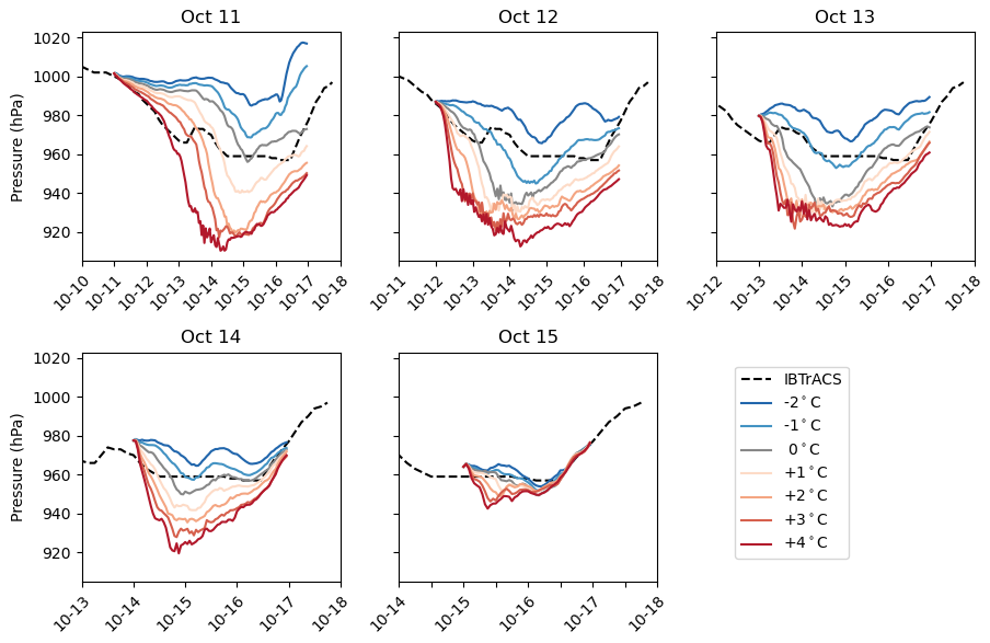 Similarly, we can examine the time series of central pressure for the simulations with different start dates. Figure A2 shows a consistent trend across initialization dates that in simulations with higher temperature forcing Ophelia has a lower central pressure. These lower central pressures are also accompanied with greater intensification rates. The spread of minimum central pressures across different temperature forcings is less with later simulation initialization time: 11 October has a difference of 78 hPa where 15 October differs by only 11 hPa, and we see a much higher minimum central pressure on 11 October than the other initialization dates. This suggests that the effect of the alternate climate on the 15 October run is less. This could be due to less time under conditions favourable for strengthening or because the nature of the storm has changed to one less affected by changing climate.