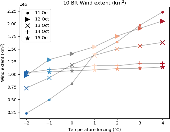 For each simulation, we observe a positive relationship between increased temperature forcing and increased wind extent. This is consistent with the findings of Radu et al. (2014), who note that under warmer climate conditions the TC radius increases. This effect is most pronounced in the 11 October simulations, which show an increase of 877 % in the wind field between the −2 and +4 °C simulations. 12 and 13 October show modest 110 % and 124 % increases in wind field extent, while the 14 and 15 October simulations, in contrast, change very little with increasing temperature forcing (17 % and 10 % increases respectively). This suggests both that the 14 and 15 October simulations do not have enough time to adjust to the new climate conditions before undergoing ETT, and that ETC size is less affected by changes in climate conditions than TC size.
