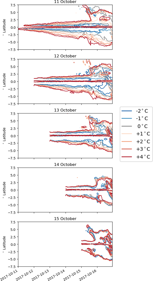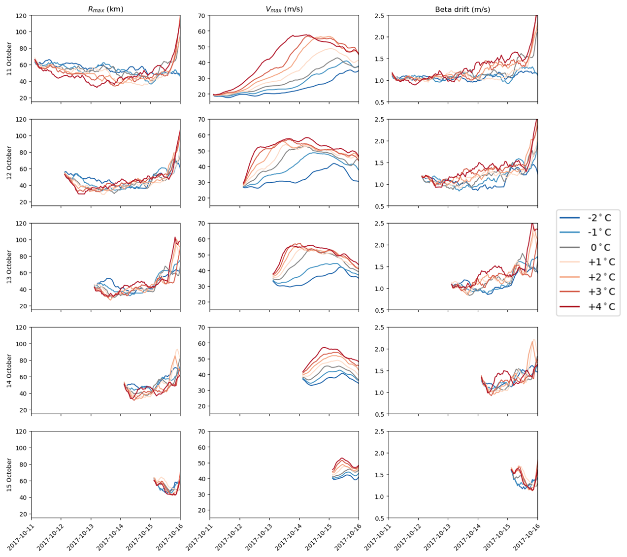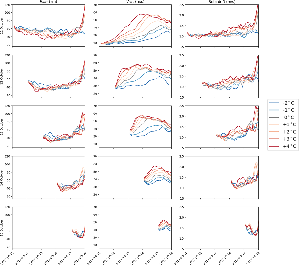 At the end of our simulation time (17 October 12:00 UTC, Fig. 8, right panel), the +2 °C through +4 °C simulations are still strongly warm-core, the −2 °C through 0 °C have become cold core, while the +1 °C exists as a hybrid between warm-core (TC-like) and cold-core (ETC-like) storms. The persistent deep warm-core in the simulations with warming suggest that Ophelia does not finish its ETT but remains a hybrid form of a TC and ETC.