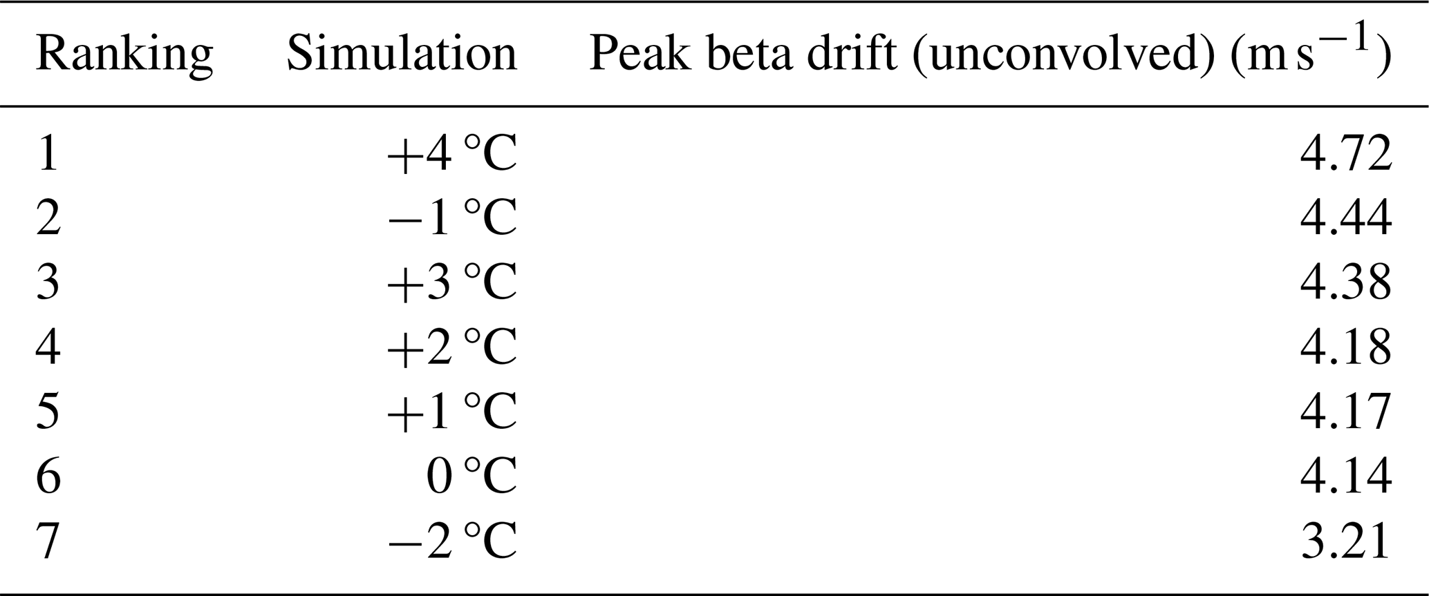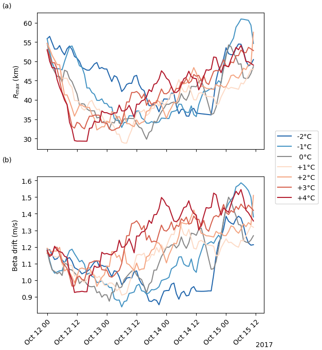 When we examine this for the entire length of the simulation, we find that there is a stratification of the beta drift with temperature: in general, storms in warmer simulations having a higher Vmax and a lower Rmax show higher values of maximum beta drift. The +4 °C has a maximum beta drift of 4.72 m s−1, where the −2 °C has a maximum beta drift of 3.21 m s−1. With the exception of the −1°C simulation, the relationship of storms in warmer simulations experiencing stronger beta drift is maintained (see Table 2). The high beta drift of the −1°C scenario can be attributed to an anomalously high Rmax. In other words, the storms in warmer simulations propagate faster and thereby further northwest than those in cooler simulations.