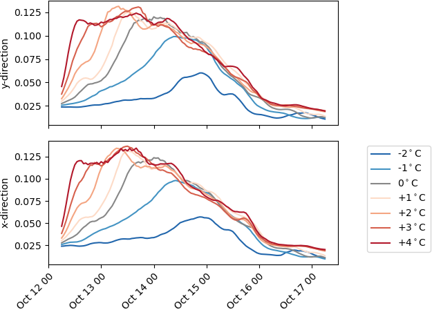 In Sect. 4.2 we saw that increased temperature forcing led to a greater extent of high winds. We performed the same analyses on the other initialization times and plotted the results in Fig. A3. To prevent the bias of longer simulations automatically having larger wind extents, we select only the data present in the timespan shared by all the simulations, 15 October 00:00 UTC to 16 October 23:00 UTC.