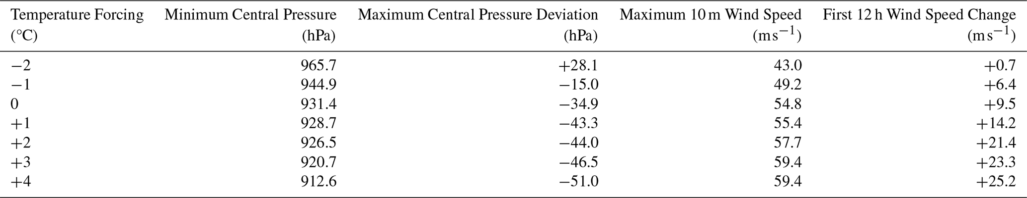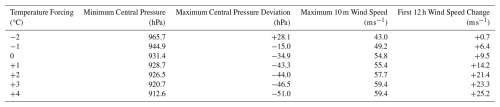 Table 1Minimum central pressure, maximum central pressure deviation compared to IBTrACS observations, and maximum 10 m wind speed for each alternate climate scenario.