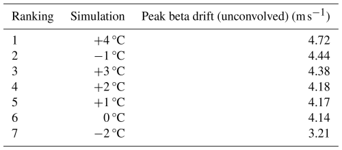 We find that the beta drift is generally higher for the storms in warmer simulations and lower for those in colder simulations, especially in the first 72 h of the simulations (see Fig. B3b). The +4 °C simulation has a 72 h mean beta drift of 1.25 m s−1, and the −2 °C has a mean beta drift of 1.02 m s−1. These are small changes compared to the 15 m s−1 translation speed the storms achieve around 15 October 00:00 UTC, but not negligible, especially closer to the beginning of the simulation where the storms are traveling slower; by 13 October 00:00 UTC there is already a visible difference in position between simulations (Fig. 4) but the difference in translation speed between the fastest and slowest simulations (+4 and −2 °C respectively) is only 1.59 m s−1.