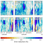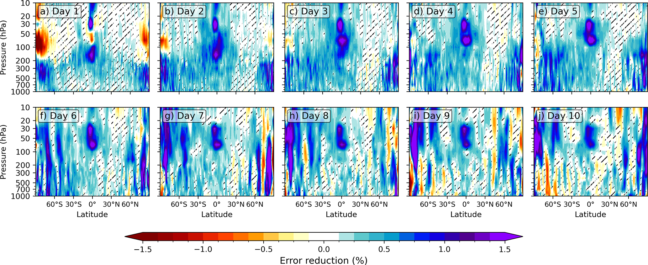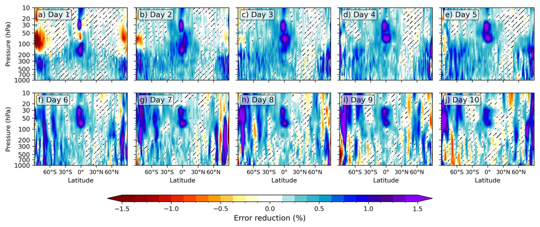 Figure 2Zonally averaged error reduction in RMSE of zonal wind forecasts vs. ERA5 from day 1 to 10 when assimilating Aeolus wind observations, during the period 2019–2022. Positive impact is indicated in blue, while degradation is shown in red. Hatched areas denote regions where changes are not statistically significant.