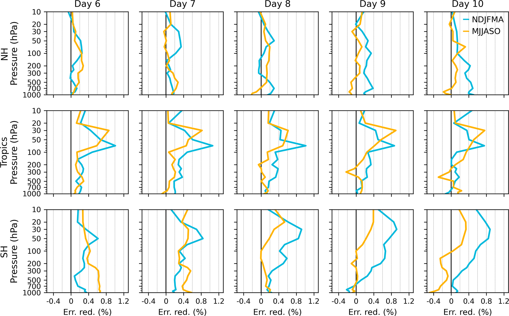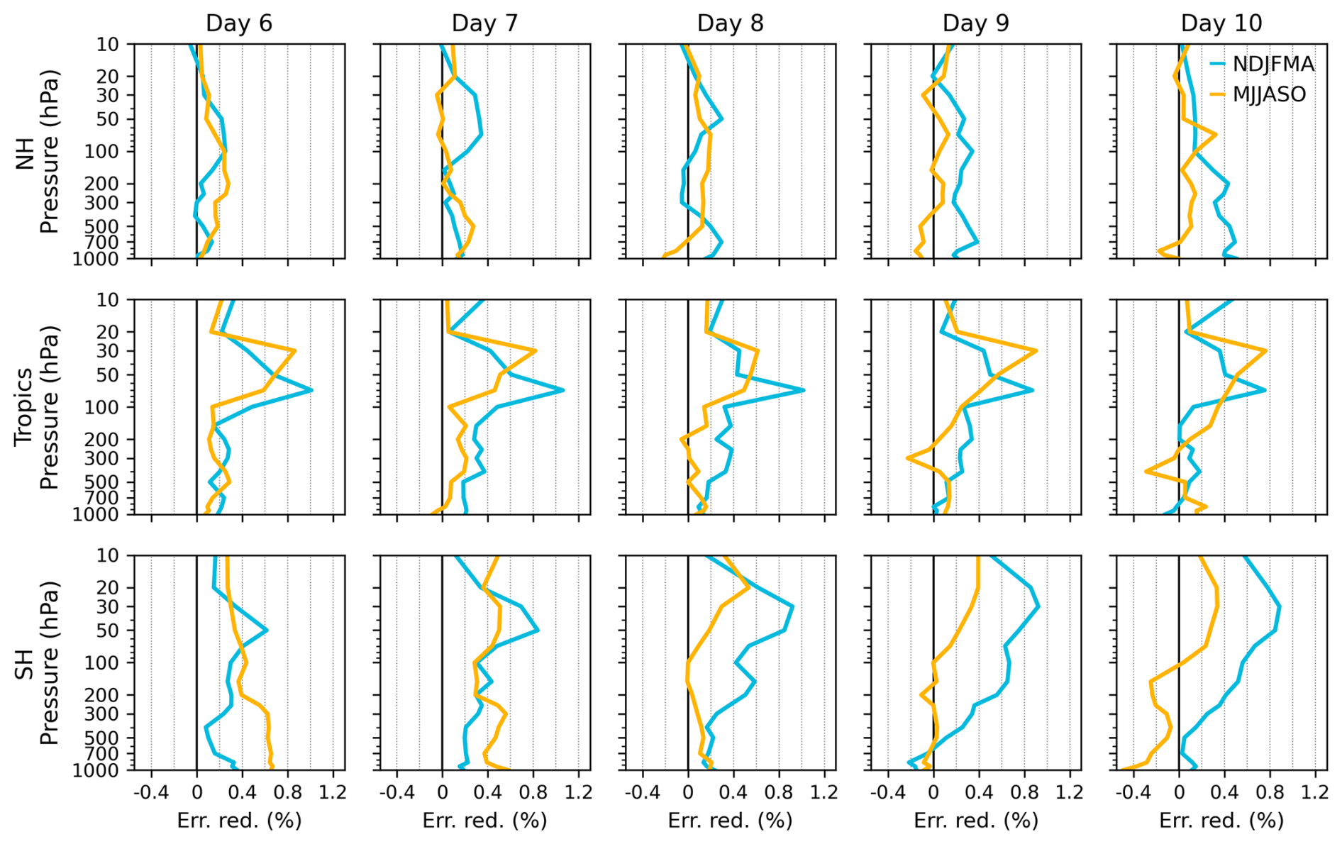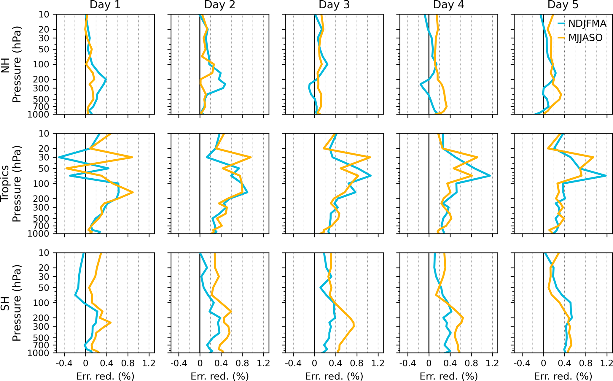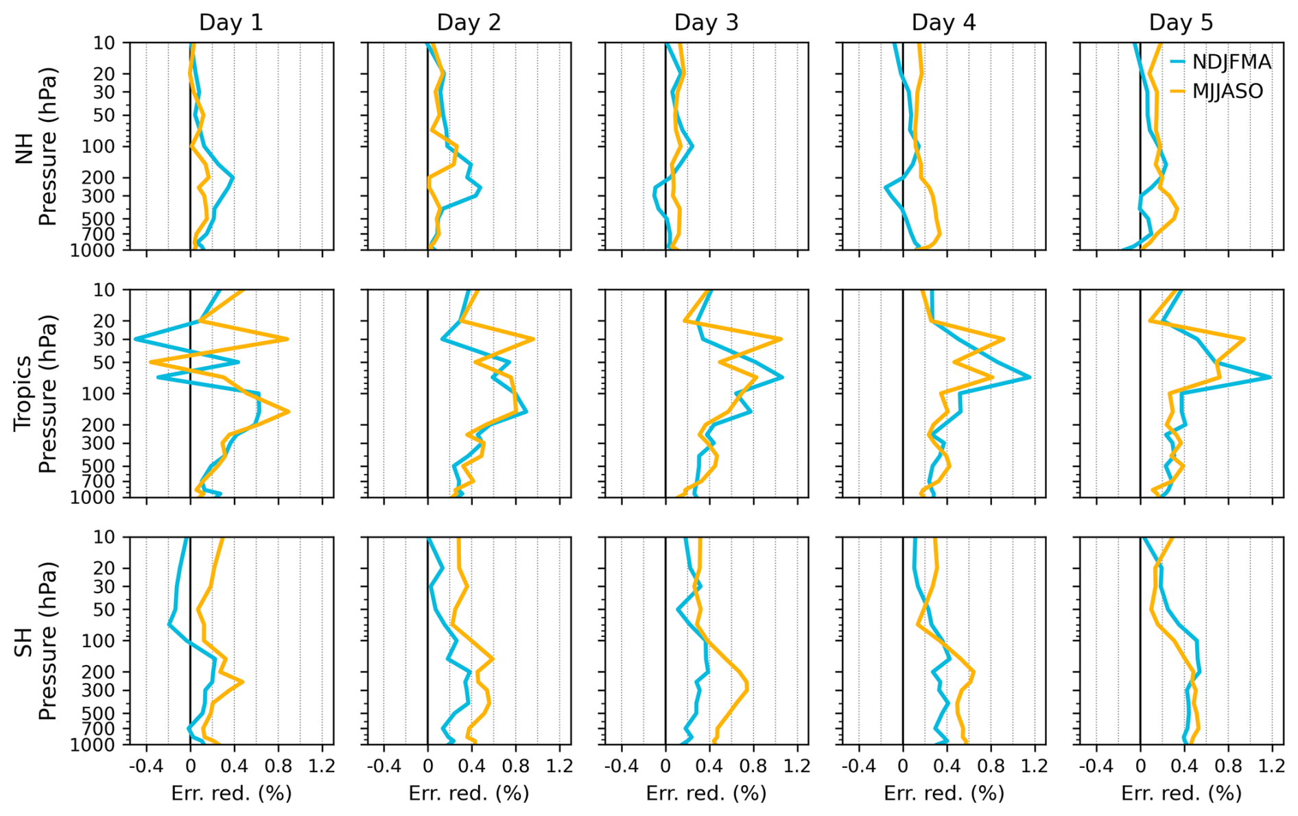 To examine the seasonal behavior of zonal wind forecast improvement, Fig. 4 shows the relative RMSE reduction from Aeolus wind observation assimilation for the extended boreal winter (NDJFMA, blue line) and the extended austral winter (MJJASO, orange line) during the first five forecast days, stratified by hemisphere (NH, Tropics, and SH).