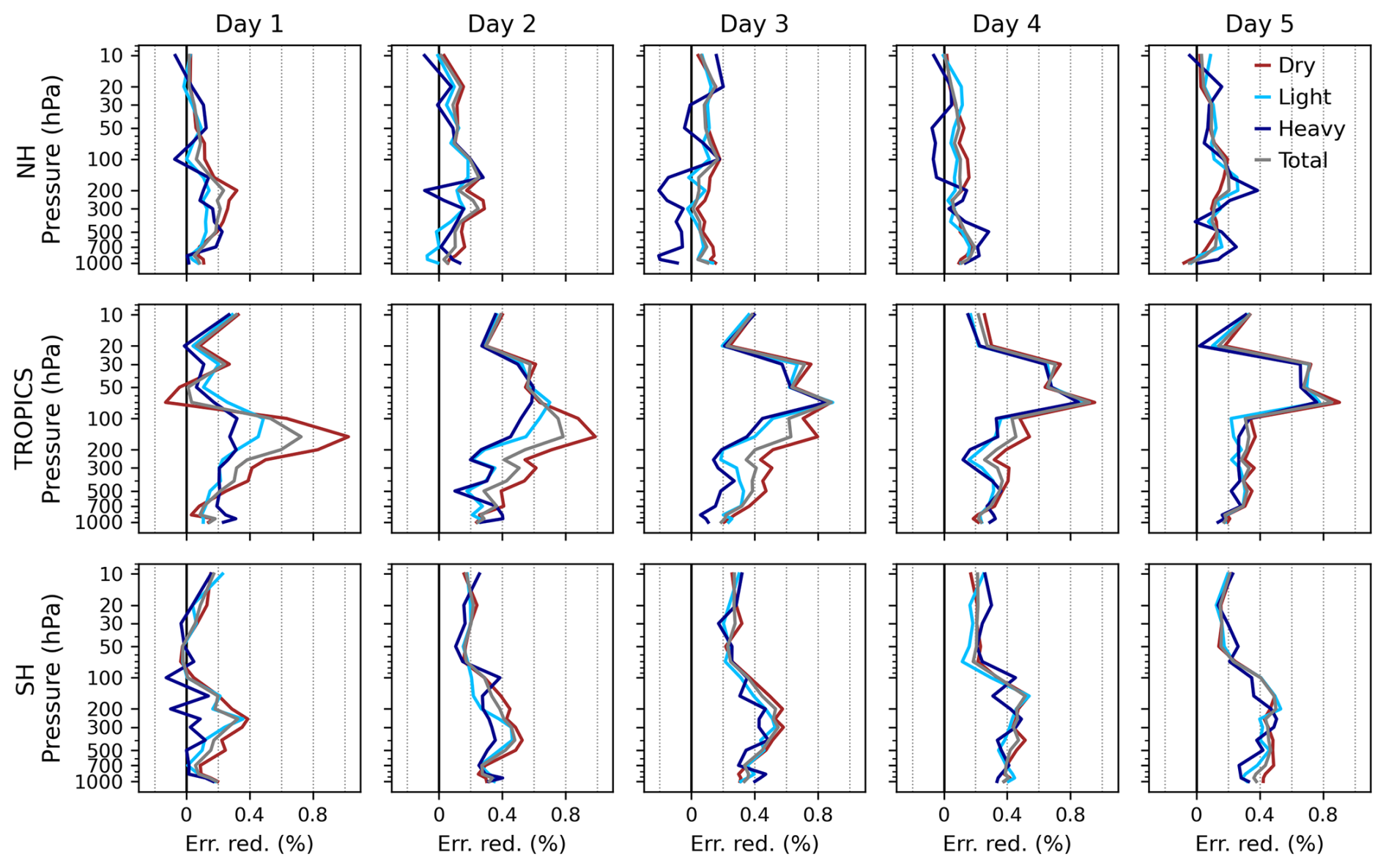 Figure 5 presents the relative RMSE reduction in zonal wind forecasts over the first five forecast days for each precipitation category across three regions: the NH (20–60° N), the tropics (20° S–20° N), and the SH (60–20° S). The clearest signal emerges in the tropics, where dry conditions consistently show greater forecast improvements compared to light or heavy precipitation cases. At 150 hPa on forecast day 1, RMSE reductions reach up to 1 % under dry conditions, compared to approximately 0.3 %–0.4 % in rainy regimes. The strongest improvements occur in persistently dry regions (Fig. 1a) and may be linked to key areas of forecast enhancement in the UTLS depicted in Fig. 3. This contrast across precipitation regimes gradually decreases with forecast days and becomes negligible by day 5. Additionally, we observe a vertical shift of the maximum impact into the stratosphere (above 100 hPa) at longer forecast days, where differences across precipitation categories also become minimal. These levels are generally above most deep cloud layers and therefore less affected by surface precipitation regimes. In the SH, peak improvements are observed near 300 hPa, with dry conditions showing slightly greater RMSE reductions (0.4 %–0.5 %) compared to rainy regimes. In the SH stratosphere, however, the impact remains limited, with reductions around 0.2 % across all categories. In the NH, the response is more uniform across precipitation regimes, with relatively consistent improvements of 0.1 %–0.2 % throughout the vertical profile. This weaker signal likely reflects the denser observational network in the NH compared to the tropics and the SH.
