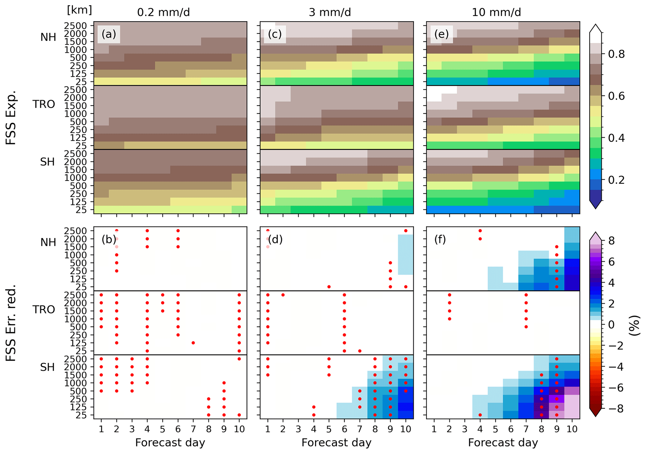 The assimilation of Aeolus winds shows a clear positive impact in both hemispheres, with the SH exhibiting the most consistent and substantial improvements, particularly at small and medium spatial scales. At higher thresholds (10 mm d−1), FSS improvements emerge as early as forecast day 4 at the smallest scales (approximately 25 km), reaching more than 8 % by day 10. At lower thresholds (0.2 mm d−1), no visible improvement is detected, indicating negligible impact on light precipitation. The spatial structure of the improvements indicates that gains are largest where forecast skill is low (FSS < 0.5). Moreover, the range of affected scales broadens with forecast days, eventually encompassing the largest scales (approximately 2500 km) by day 5. Statistically significant improvements are most evident for days 7–10 at the 3 mm d−1 threshold and for days 8–9 at 10 mm d−1, suggesting that Aeolus contributes to a better representation of heavy rainfall events in the SH, likely due to the limited availability of in situ wind observations in this region.
