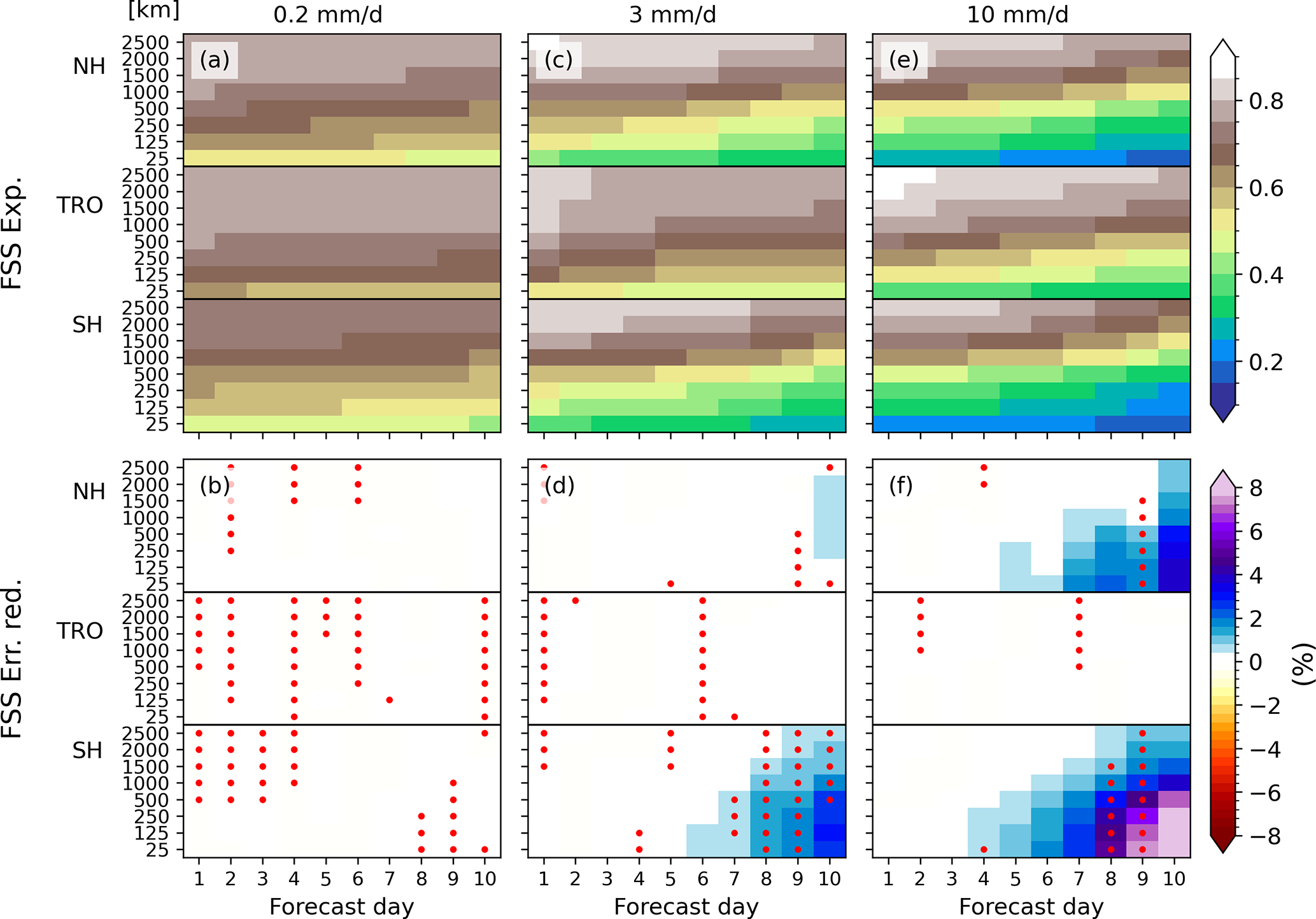 FSS values decrease with increasing precipitation thresholds and decreasing spatial scales (Fig. 6a, c, e), reflecting the increasing difficulty of accurately forecasting heavier precipitation at finer scales. This behavior is particularly pronounced in the extratropics (Fig. 6b, d, f).