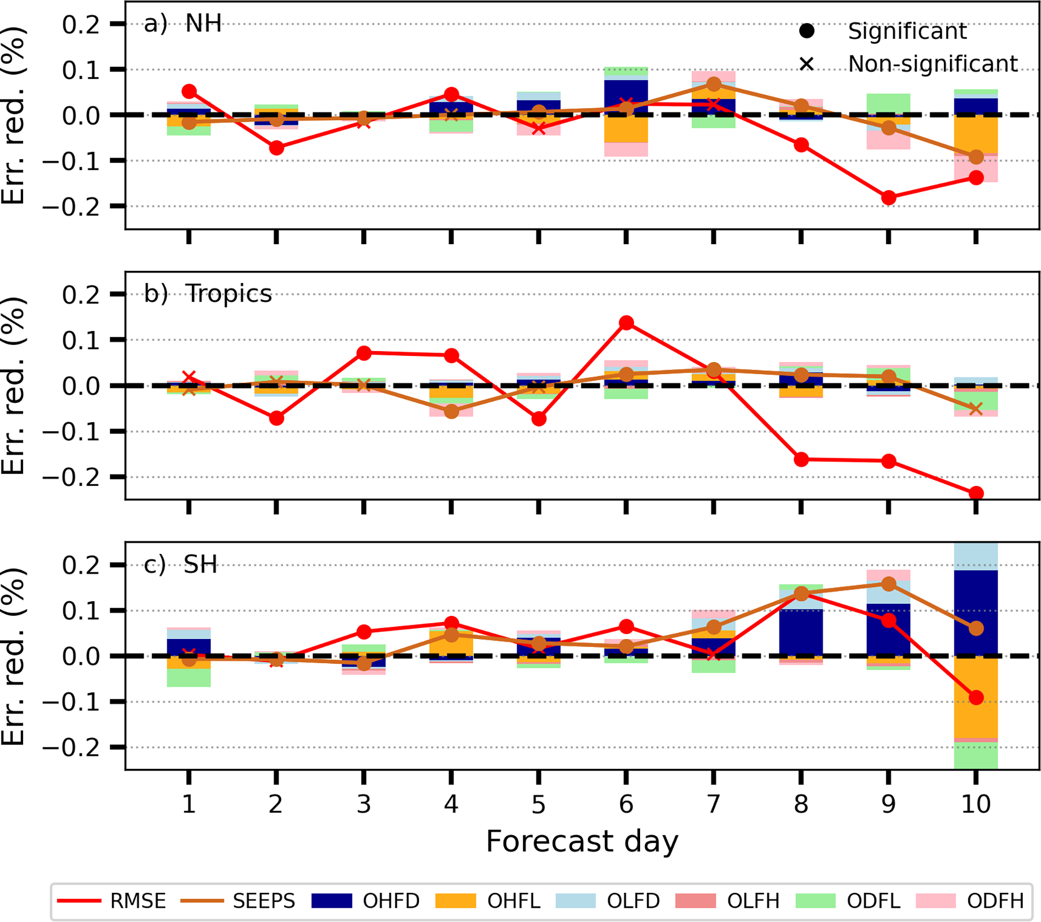 Figure 7 presents the relative error reduction in SEEPS (brown line), alongside the corresponding reduction in RMSE of rainfall forecasts (red line), with RMSE values aggregated to a 1° grid to reduce the double-penalty effect commonly seen in precipitation verification. Statistical significance is indicated by dots (significant) and crosses (not significant). In addition, the colored bars identify the dominant precipitation category (dry, light, or heavy) contributing to changes in the SEEPS score at each forecast day. Overall, the average impact of Aeolus assimilation on precipitation forecasts, as measured by SEEPS and RMSE over the full study period, is relatively modest. In the NH (Fig. 7a), SEEPS improvements remain close to zero across all forecast days, although most values are statistically significant. The RMSE of rainfall forecasts exhibits minor fluctuations around zero, indicating limited and inconsistent forecast improvement in this region. In the Tropics (Fig. 7b), SEEPS shows predominantly non-significant changes during the first five days. From day 6 onwards, small but statistically significant improvements emerge, reaching approximately 0.03 % by day 9. However, no precipitation forecast category dominates the contribution to this improvement. The corresponding RMSE displays a similarly variable pattern with no strong trend, highlighting the challenge of achieving consistent forecast gains in convectively active regions. In contrast, the SH (Fig. 7c) demonstrates more coherent improvements. Statistically significant increases in SEEPS become evident from day 4 onward, rising steadily to about 0.15 % by day 9. Notably, from days 7 to 10, the SEEPS gains are primarily driven by improvements in the OHFD (Observed Heavy, Forecast Dry) category, suggesting that Aeolus contributes to reducing false dry and light forecasts during heavy precipitation events. The rainfall RMSE in the SH also shows a clear signal of consistent and significant improvements from day 3 to day 9, averaging around 0.05 %.