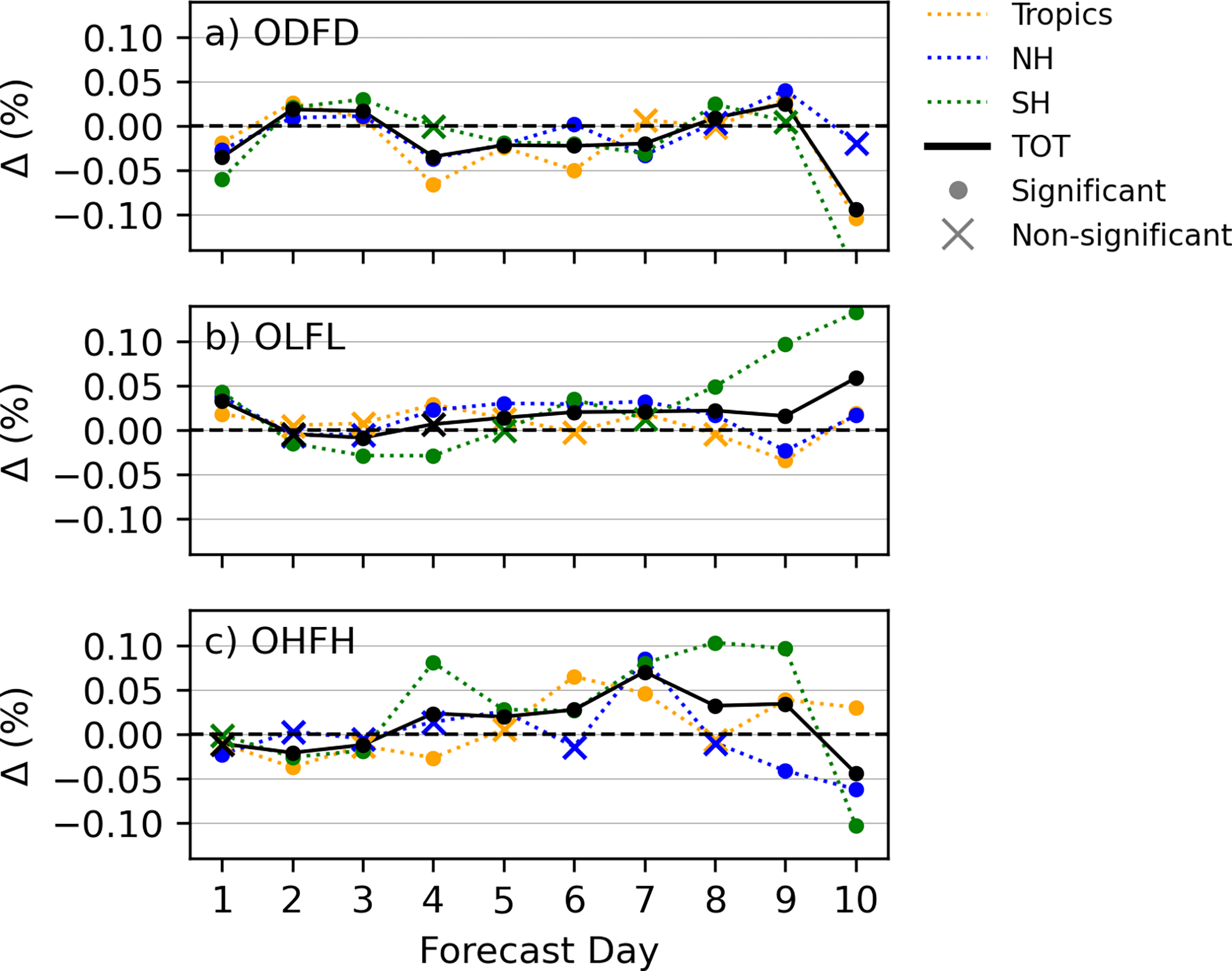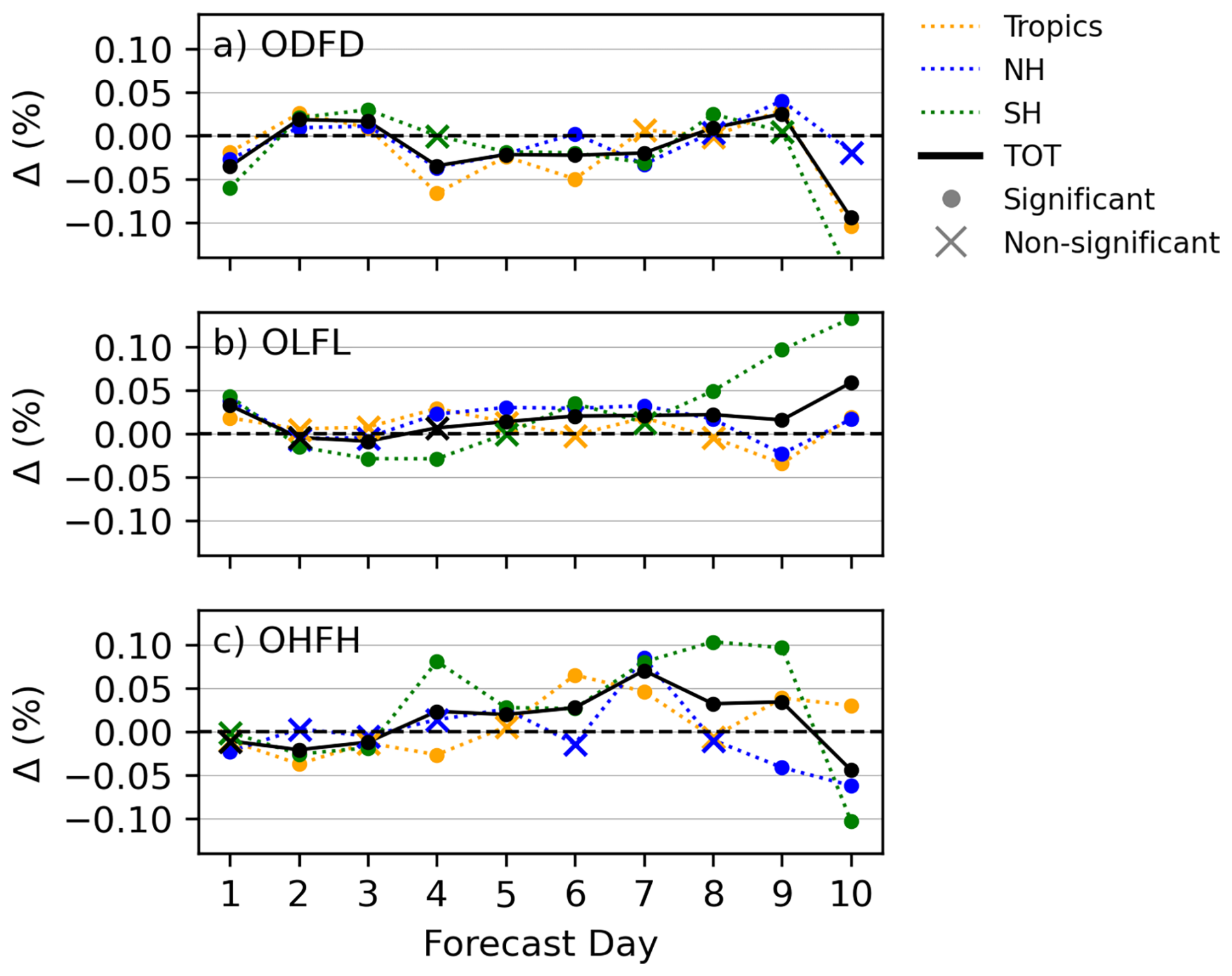 Next, we assess changes in ECMWF categorical precipitation forecasts. Figure 9 presents the relative changes in the proportion of correctly predicted precipitation categories for ODFD (a), OLFL (b), and OHFH (c), which represent correct forecasts of dry, light, and heavy precipitation, respectively. The evaluation is performed across the Tropics, Northern Hemisphere (NH), Southern Hemisphere (SH), and globally (TOT). Importantly, this analysis includes all available forecast–observation pairs, including cases where the probability of dryness exceeds 0.85 %. This ensures a more complete assessment of categorical forecast performance, beyond the subset used for SEEPS. Statistical significance of the differences is assessed using a χ2 test, with circles indicating significant improvement and crosses indicating non-significant changes. For the ODFD category (Observed Dry Forecast Dry), a small but statistically significant increase across all regions (up to 0.02 %) is observed at forecast days 2 and 3, followed by a decline between days 4–7, and a modest rise again toward day 9.