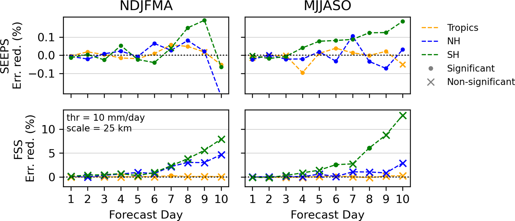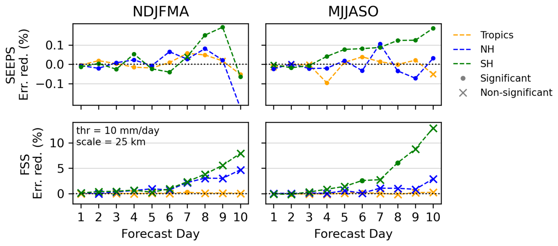 Figure 10SEEPS (top) and FSS (bottom) error reduction for NDJFMA (left) and MJJASO (right) seasons, shown by forecast day (1–10) across three regions: Tropics, NH, and SH. Dots indicate statistically significant improvements, and crosses denote non-significant differences. FSS is computed using a 10 mm d−1 threshold and 25 km spatial scale.