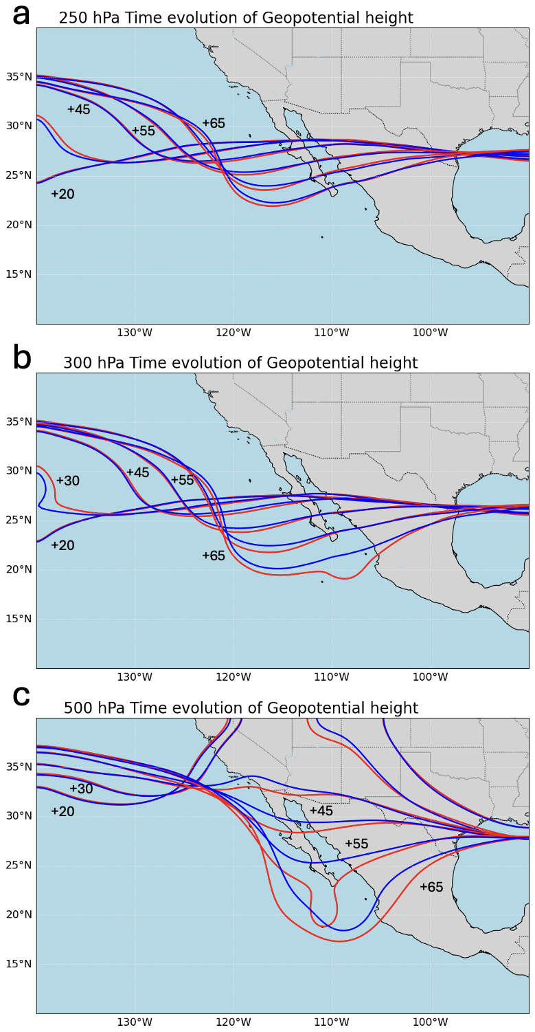 Since SST fail to explain the differences observed among the ensemble members in Lidia's intensification, we examine the mid- and upper-level dynamic environment. Figure 4 shows the eastward progression of a trough in both ensemble groups. The trough is notably broader in the P80-ensemble, particularly from time step +55 h. At 250 and 300 hPa (Fig. 4a, b), the isohypses in the P80-ensemble exhibit substantial deformation toward Lidia. The trough deepens further at 500 hPa (Fig. 4c), extending southward to approximately 20° N. This southward intrusion brings the trough into closer proximity with the tropical cyclone, especially in the RI ensemble members, where a more pronounced elongation is observed. This configuration likely favored a moist and unstable environment ahead of the cyclone, while simultaneously enhancing vorticity advection and synoptic-scale ascent.