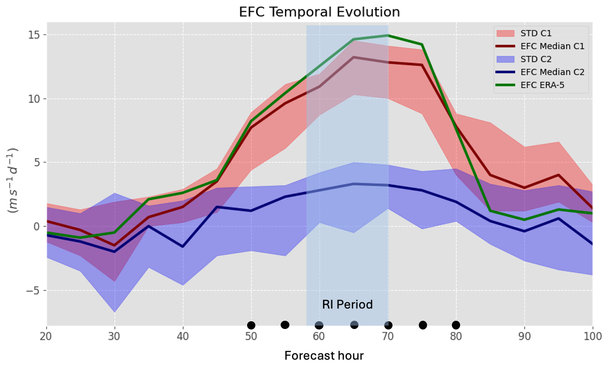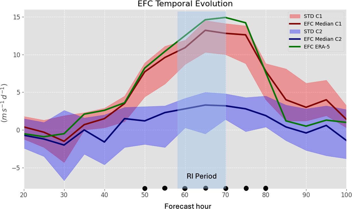 where is the perturbation radial wind, the perturbation tangential wind, and the overbar denotes the azimuthal mean, computed in storm-relative coordinates. Based on the methodology of DeMaria et al. (1993) and Hanley et al. (2001), the EFC is computed over a radial range of 300 to 600 km for each time step during RI period. The calculation spans the full 96 h forecast period starting from the model initialization, thereby encompassing pre-RI, RI, and post-RI phases for both ERA5 and members groups.