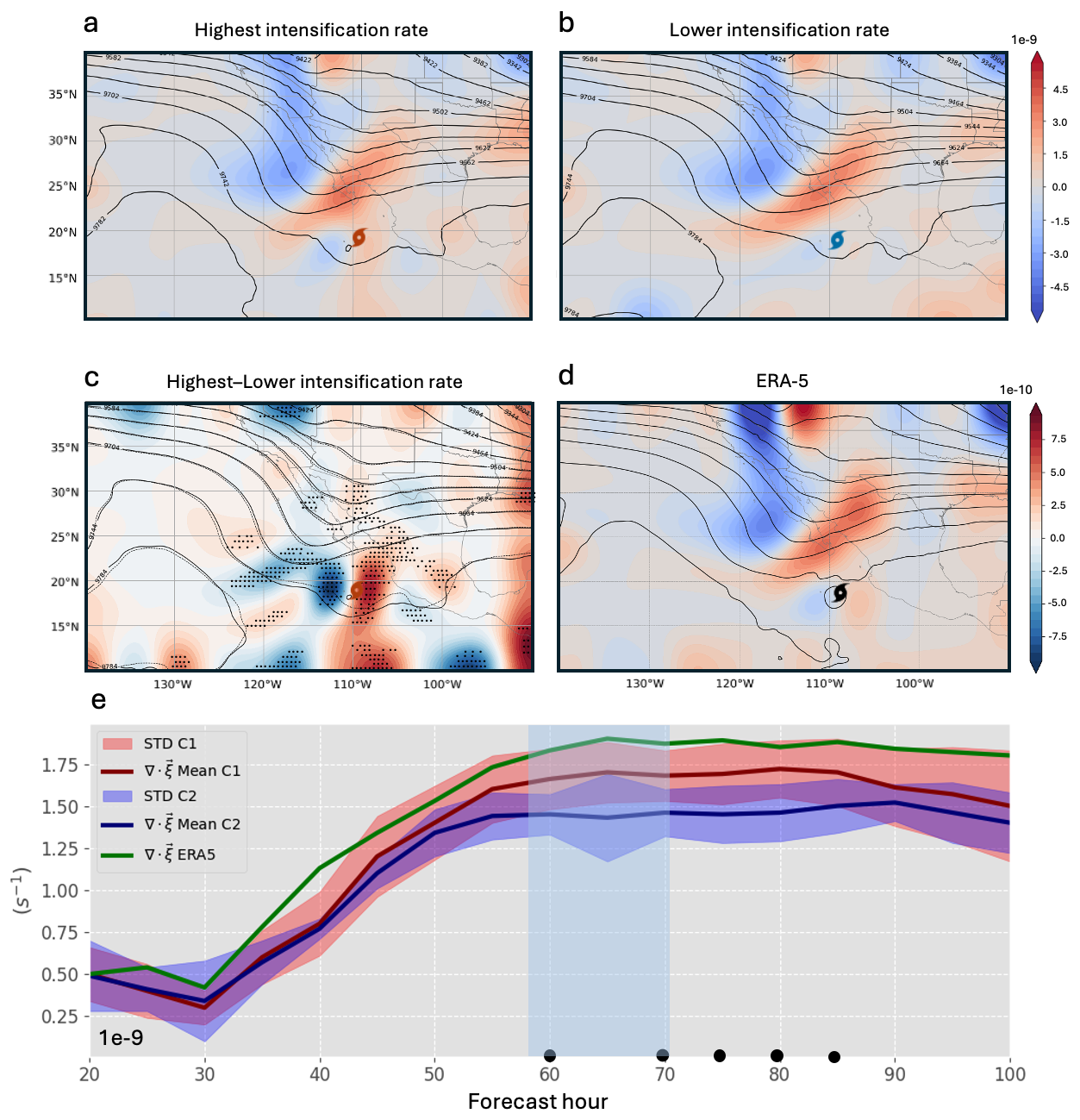 The data sets are based on forecasts from the Integrated Forecasting System (IFS) of the ECMWF. This study uses the operational perturbed forecast ensemble generated by the EPS (Cycle 48r1: ECMWF, 2023) with 50 perturbed members. Each perturbed member has a horizontal resolution of 0.1° and 137 vertical levels. The last initialization is selected since it features a large spread of Hurricane Lidia trajectories, corresponding to the 8 October, 00:00 UTC initialization, which spans a 96 h forecast window with 1 h time steps. Additionally, to assess the performance of each composite group, key atmospheric fields are computed using data from the ERA5 climate reanalysis (Hersbach et al., 2020, 2023a, b) with 0.25° horizontal resolution and 37 vertical levels, during the period with the highest intensification rate.