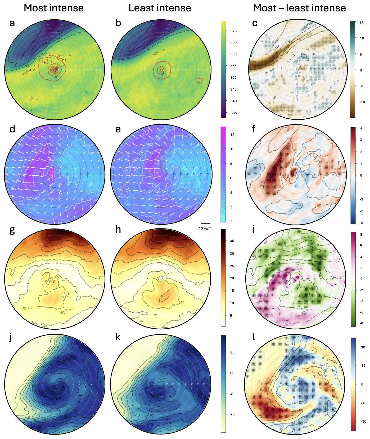 Figure 10SCC for the time step 55 h of: θ (K) at 1.5 PVU for (a) P80, (b) P20 IRG, and (c) P80−P20 IRG, red contours are MSPL; |Virr| (m s−1), at 200 hPa for (d) P80, (e) P20 IRG, and (f) P80−P20 IRG; VWS (m s−1; between 0 and 500 km radius) for (g) P80, (h) P20 IRG and (i) P80−P20 IRG, and RH (%) (j) P80, (k) P20 IRG and (l) P80−P20 IRG at 500 hPa. Each concentric ring in the panels corresponds to 1° radius, and the outermost circle representing the SCC domain has a radius of 8°.