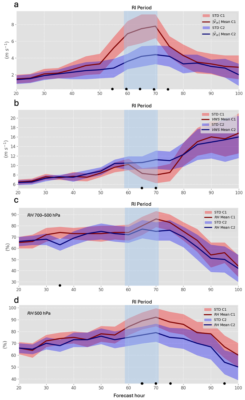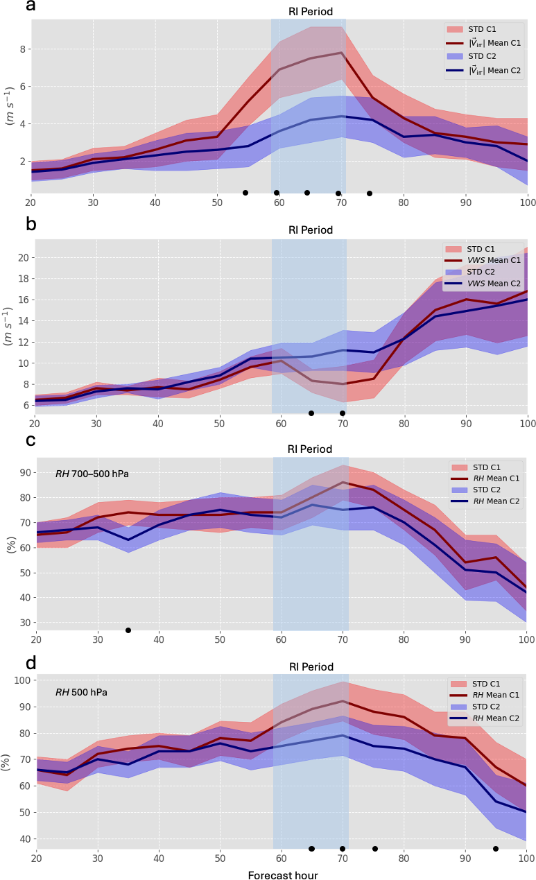 Figure 11Time evolution of (a) ageostrophic wind at 250 hPa, (b) VWS (850–200 hPa), (c) RH (700–500 hPa) and (d) RH (500 hPa) within 500 km of Lidia. Red (blue) lines show the mean for the higher (lower) IRG; shaded areas indicate SD. Light blue band indicate the RI period. Black dots denote significant differences.