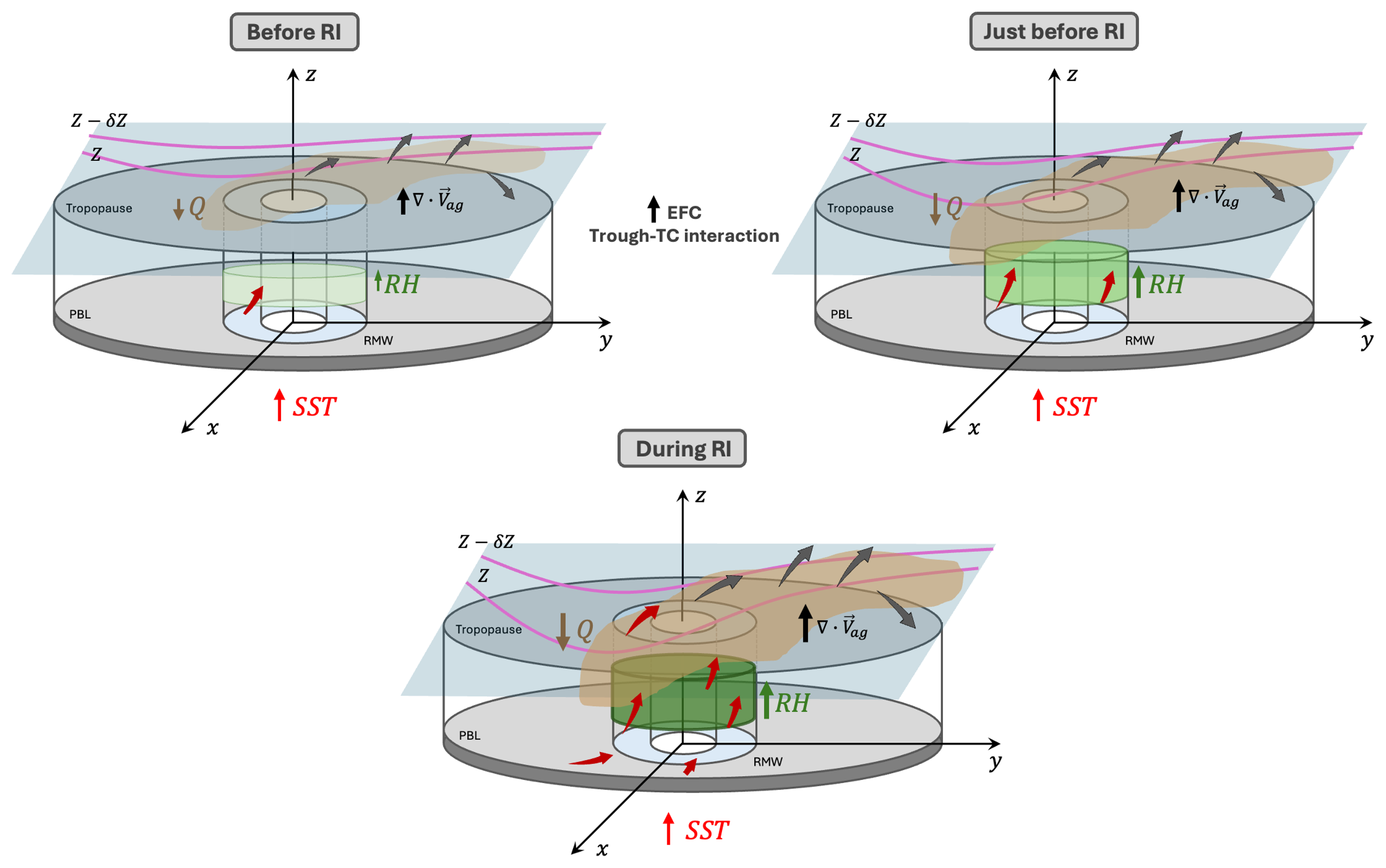 Figure 12Schematic overview of the dynamical and thermodynamic processes leading to Hurricane Lidia's RI. Before RI, the mid-level trough induces increasing dynamical forcing and weak ascent near the cyclone. Just before RI, enhanced negative Trenberth forcing (shaded region in brown) strengthens upper-level divergence (gray arrows) and mid-tropospheric moistening (light green cylinders). During RI, the interaction between the trough and the vortex maximizes ascent (red arrows), increases RH (green cylinder), and combines with elevated SST to support a deep, vertically aligned convective core.