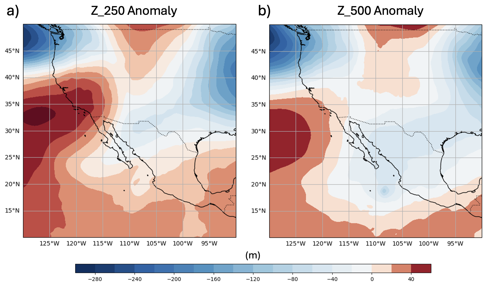 Figure A2Z anomalies from ERA5 for (a) 250 and (b) 500 hPa during the period surrounding Lidia's RI (12:00 UTC on 9 October 2023). Warm (red) shading denotes positive height anomalies, while cool (blue) shading indicates negative anomalies.