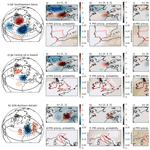 Composites of each variable are partially masked, retaining only gridpoints where anomalies are (i) statistically significant (p < 0.05), (ii) high amplitude (> 0.25 gridpoint standard deviation), and (iii) spatially coherent (significant, high amplitude anomalies form a connected area of > 5 × 105 km2). These masked composites are termed precursor patterns. This masking is intended to algorithmically imitate the approach a researcher might use to hand-define a variability mode such as the box-based North Atlantic Oscillation (NAO) or El Niño–Southern Oscillation. We maintain the same masking parameters as Dorrington et al. (2024a, b) as they have been shown to produce precursors that can be used to predict daily precipitation in a weather forecast context, which we take as a strong test of their dynamical relevance.