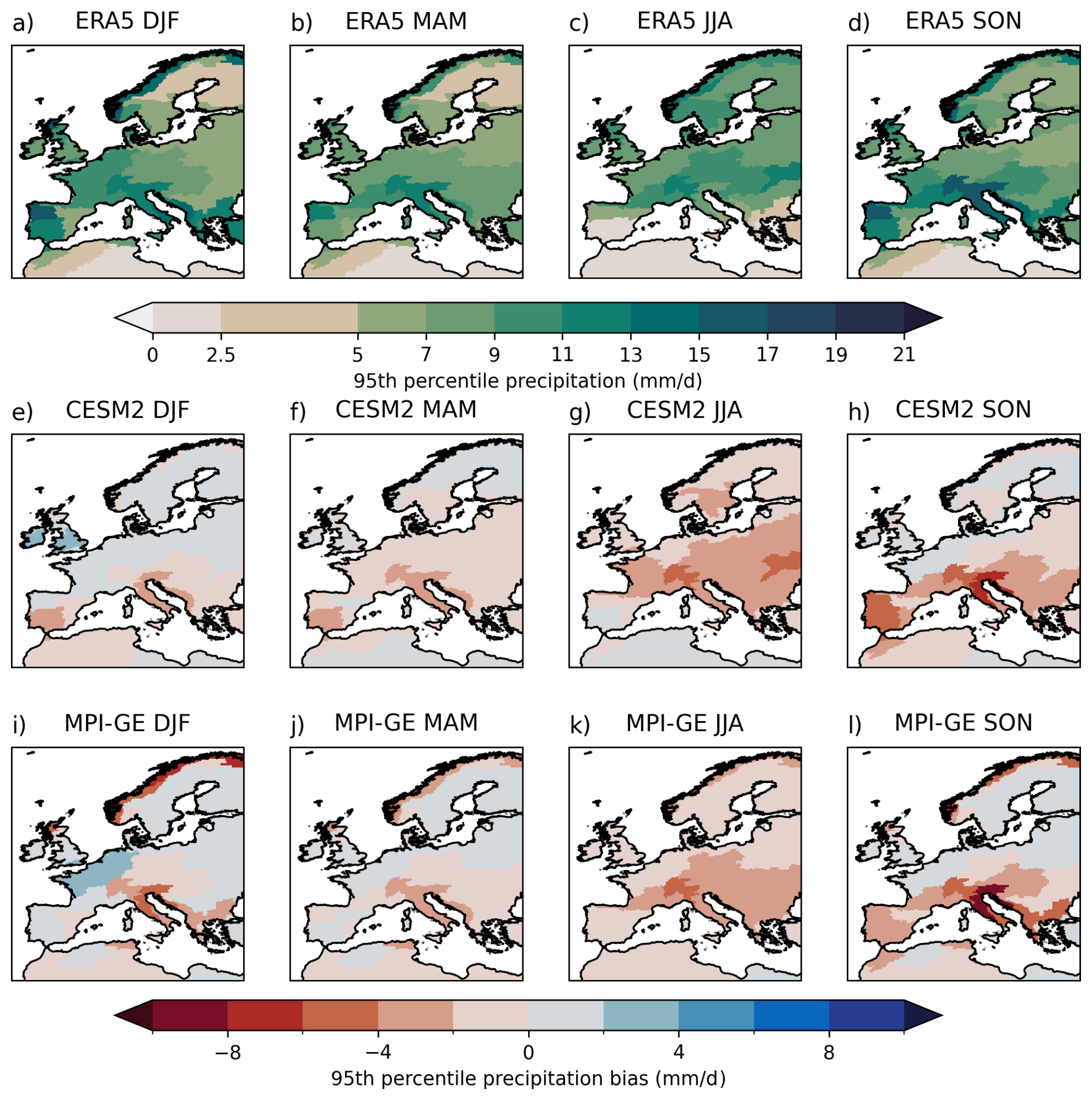 We first summarise model performance from the bulk perspective with reference to the ERA5-land climatology of 95th percentile regional precipitation (Fig. 2a–d). We term precipitation over this 95th percentile threshold as heavy precipitation, but this should always be understood in local terms. The 95th percentile is highly variable across seasons and regions, ranging from less than 2.5 mm d−1 to as much as 25 mm d−1 (cf. Table S1). Both CESM2 and MPI-GE generally underestimate the intensity of the 95th percentile of precipitation (Fig. 2e–l), especially in summer. Biases are typically largest in mountainous regions, but this is not universally the case: MPI-GE performs well over the Iberian mountains for example, while CESM2 performs well over the Scandinavian mountains. Pronounced wet biases are rare, but can be seen in DJF in some western European regions in both models.