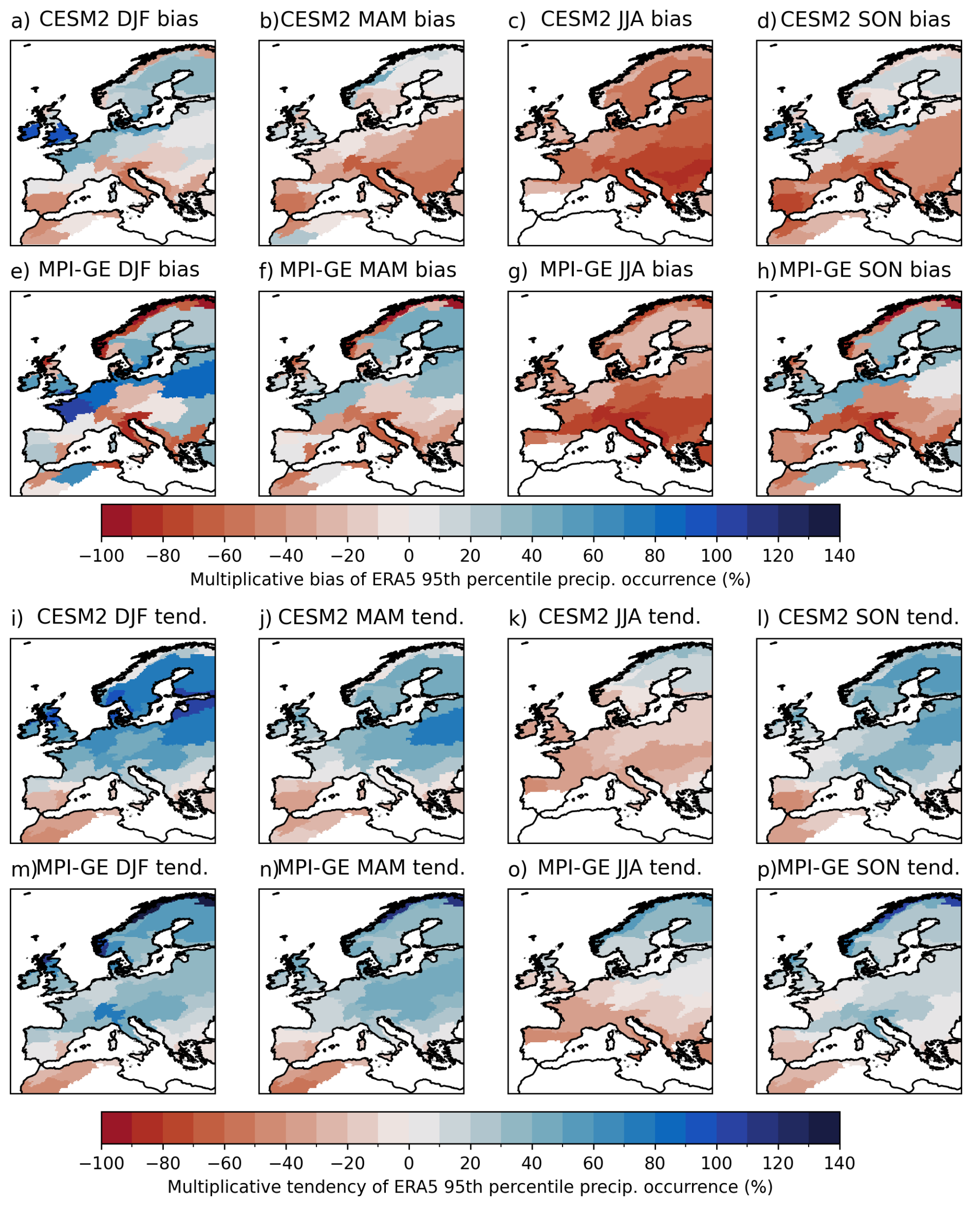 We focus on the occurrence probability of heavy precipitation (Fig. 3a–h), but there is a strong monotonic relation between deviations in extreme precipitation intensity and occurrence (cf. Fig. S3). Even in regions with the largest magnitude dry biases, such as the Alps or northern Scandinavia (cf. Fig. 2), both models can produce heavy precipitation events of real-world intensity. Nevertheless, occurrence biases worse than −80 % – visible for both models in JJA and for MPI-GE in mountainous domains throughout the year – indicate cases where 95th percentile real-world events are akin to 99th percentile or greater events in the model. Positive occurrence biases are also seen in many regions: the Atlantic coast of Europe in SON and DJF receives 30 %–110 % more heavy precipitation events in the two models than in reality. This motivates our choice to define heavy precipitation events with reference to reanalysis precipitation thresholds, as a pan-European analysis using model-derived thresholds would mix events of differing magnitudes.