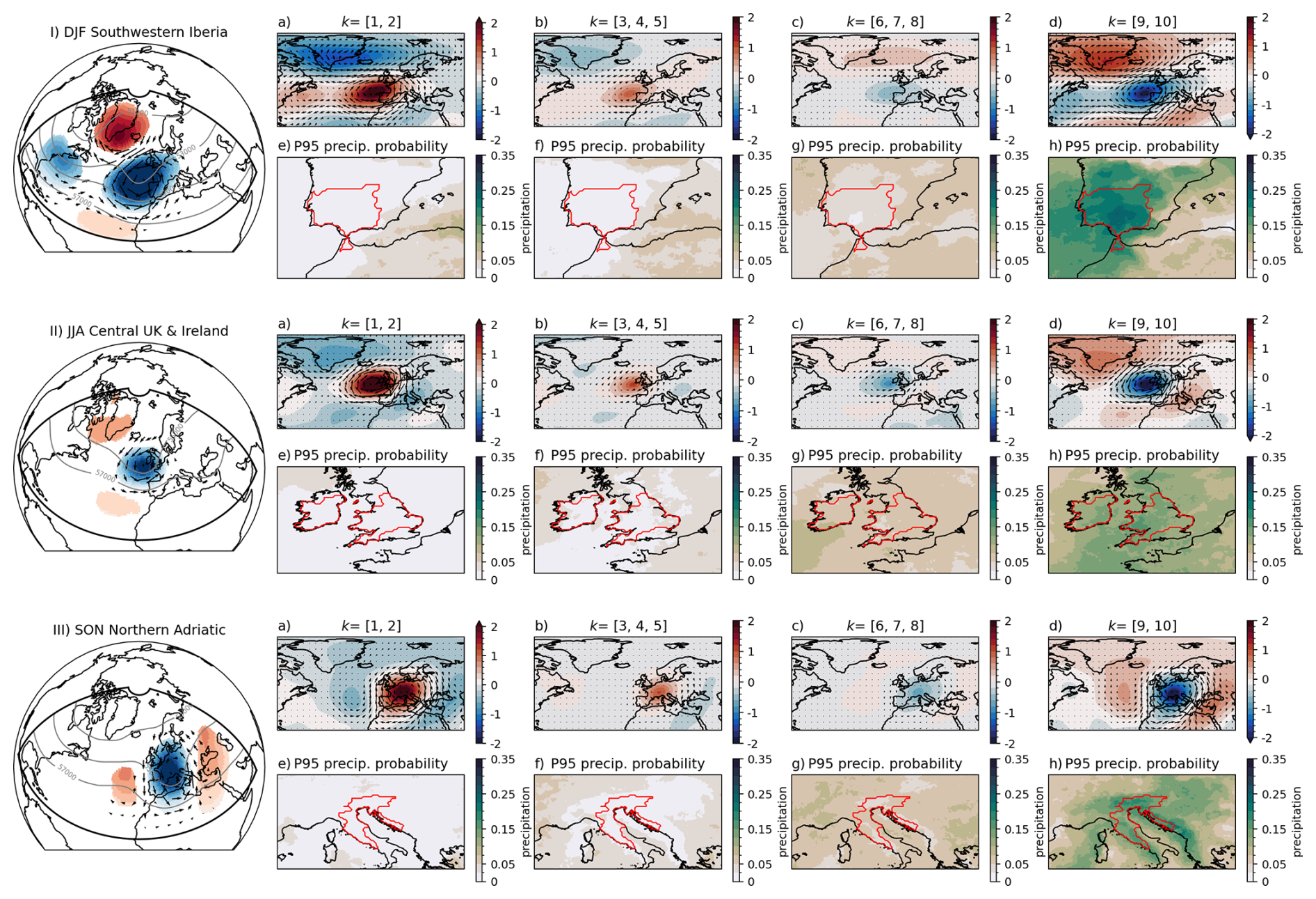 Using southwestern Iberia during DJF as an example, Fig. 4I shows the identified precursor patterns; the low-level jet is shifted equatorward, and an omega-type block is present over the Atlantic. This pattern favours the convergence of moist Atlantic airmasses from the north and west into the region (as also documented in Dorrington et al., 2024a). Figure S4 shows the precursor patterns for each variable in more detail. The Z500, V850 and U850 precursor indices that summarise the variability of this flow pattern are combined into the multivariate index S, and Fig. 4Ia–d shows ERA5 circulation composites for different deciles of S. High decile composites (k = 9, 10) closely match the precursor pattern, while low deciles (k = 1, 2) show an approximately inverse flow with anticylonic ridging to the west of Iberia and weakened regional westerlies. Figure 4Ie–h confirms that strong precursors correspond to elevated heavy precipitation probability, validated here with a different precipitation dataset than that used to define the patterns – gridpoint-wise heavy precipitation occurrence computed from MSWEP data.