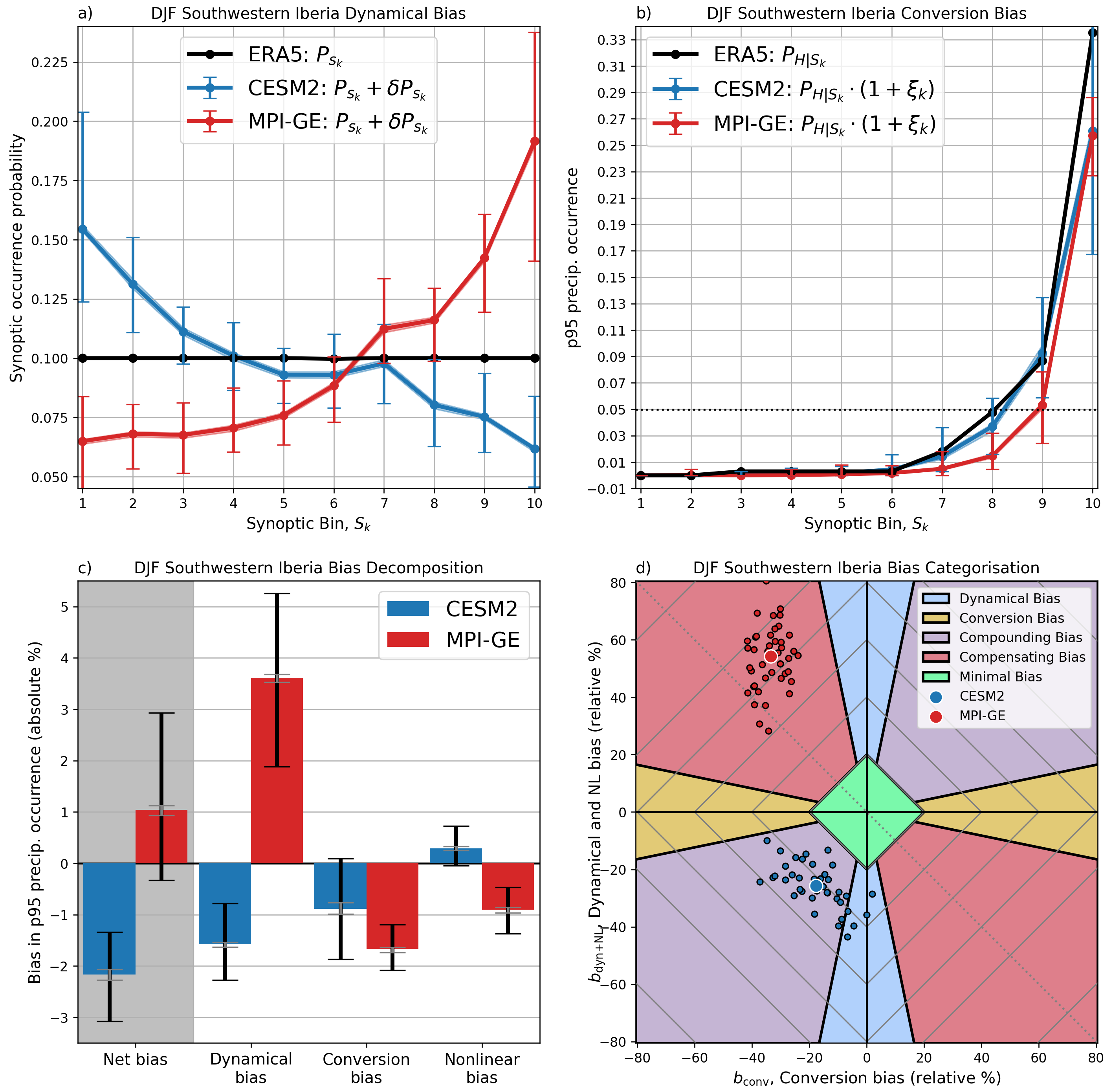 Figure 5Flow-dependent precipitation bias for southwestern Iberia during DJF. (a) Occurrence of different bins of the synoptic index over the historical period. Differences between model (red,blue) and ERA5 reference values (black) determine the dynamical bias. (b) Heavy precipitation occurrence conditional on synoptic index bin. Dashed black line shows the 5 % climatological heavy precipitation rate Differences between model (red,blue) and ERA5 reference values (black) determine the conversion bias. (c) Decomposition of net heavy precipitation biases into contributions from dynamical and conversion terms and their non-linear interaction. (d) A visualisation of model bias in the 2-dimensional (2D) space of conversion bias and summed dynamical and non-linear bias. Individual ensemble members are shown with black outlines, ensemble mean values with white outlines. The dashed negative diagonal marks the line of zero net bias. Grey diamonds mark contours of constant absolute bias. The significance of the shaded regions is explained in the main text. The 95th percentile sampling uncertainty estimate is shown with shading in panels (a) and (b), grey bars in panel (c) and is smaller than the ensemble mean dot in panel (d). The full spread of internal variability is shown in bars in panels (a) and (b), black bars in panel (c) and visualised directly in panel (d).
