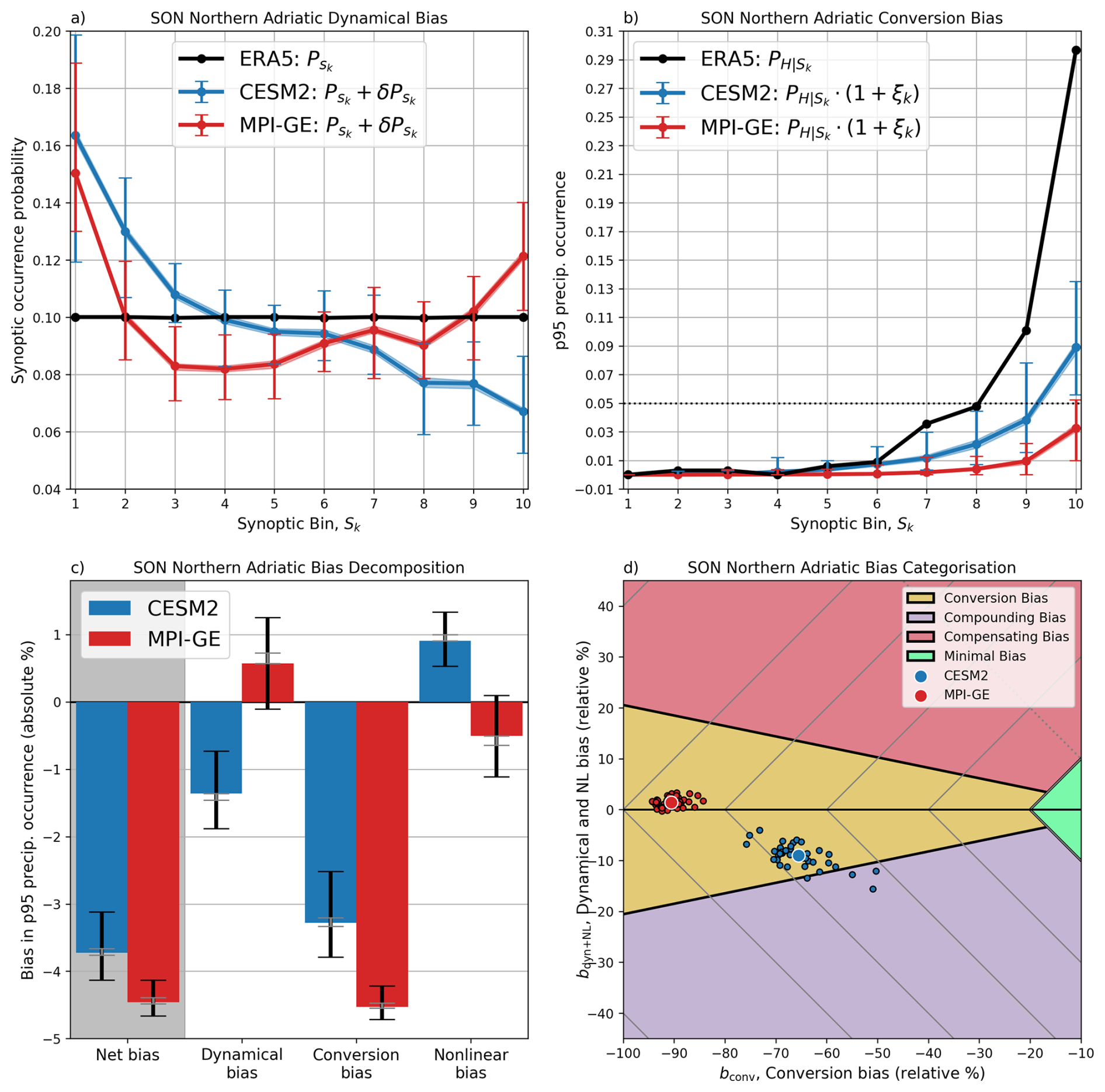 The northern Adriatic in SON provides a second example with very different bias features. In this case heavy precipitation is not predominately driven by large-scale blocks or jet anomalies but by Rossby wave packets of zonal wavenumbers 6–7 (Grazzini et al., 2021), visible in the precursor patterns and synoptic composites of Fig. 4IIIa–h. Figure 6a reveals moderate dynamical biases: MPI-GE favours strong wave-trains in phases that both favour (k = 10) and suppress (k = 1) precipitation, while CESM2's bias towards negative precursors indicates a persistent Autumn ridge over central Europe (cf. Fig. 4IIIa). However these dynamical biases are minor overall in comparison to the conversion biases shown in Fig. 6b. Both models have severe challenges converting dynamical drivers into precipitation, a conversion which in the real world relies on factors these models cannot resolve: convection, diabatic processes over the warm, shallow Adriatic, and uplift and blocking from the Apennines and the Alps. As a result, conversion dominates the bias budget for both models and non-linear terms almost completely cancel the dynamical bias (Fig. 6c–d), representing that biases in rainfall-favouring dynamics are of little importance if a model would very rarely produce heavy rain anyway. In Sect. 6 we will discuss how usable information about future heavy precipitation can be obtained from models even in such cases of severe historical bias.