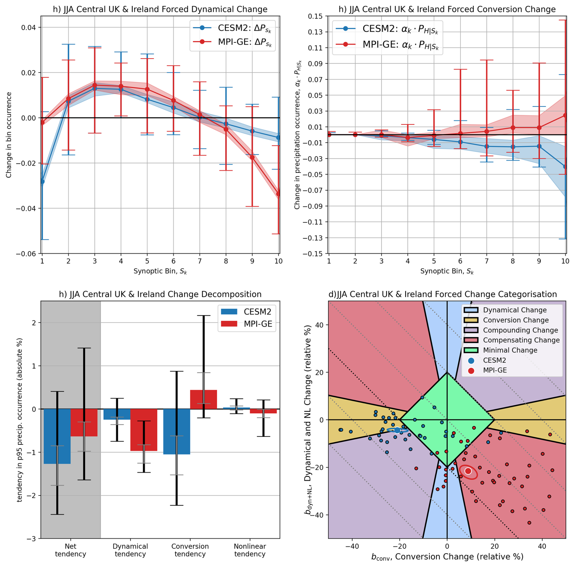 Decomposed precipitation changes can offer new insights into future scenarios, reveal sources of model disagreement, and uncover cases where model disagreement is greater than it initially appears. A good example of hidden model disagreement is given by JJA forced changes over Central UK and Ireland (Fig. 10). Current large-scale summertime heavy precipitation in this region is driven by strong, localised cyclones (cf. Fig. 4II), and is dynamically suppressed by anticyclonic ridges over the east Atlantic (Fig. 4IIa, b, e, f).