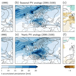 Although the dynamics of unconditioned precipitation maxima has some similarities with that of Storm Boris, there are also important differences. In contrast to the Boris case, the PV cutoff is not fully isolated from the main flow and the intensity of the anticyclonic structure downstream is lower (Fig. S14a, b, d, e). The precipitation fields generally bears a large spatial similarity with the event, with an increased intensity compared to the analogs mean as one could expect when considering seasonal and yearly maximum events. The change in the dynamics for these events is somewhat similar to the PV analogs found earlier: for seasonal maxima the precipitation field is not associated to major changes in the impacted region while the PV field sees a small reduction in its intensity in the future (Fig. S14c). For yearly maxima events, on the other hand, the PV field does not show important changes with respect to the present climate but precipitation increase strongly over the impacted region and in the Western Balkans (Fig. S14f).