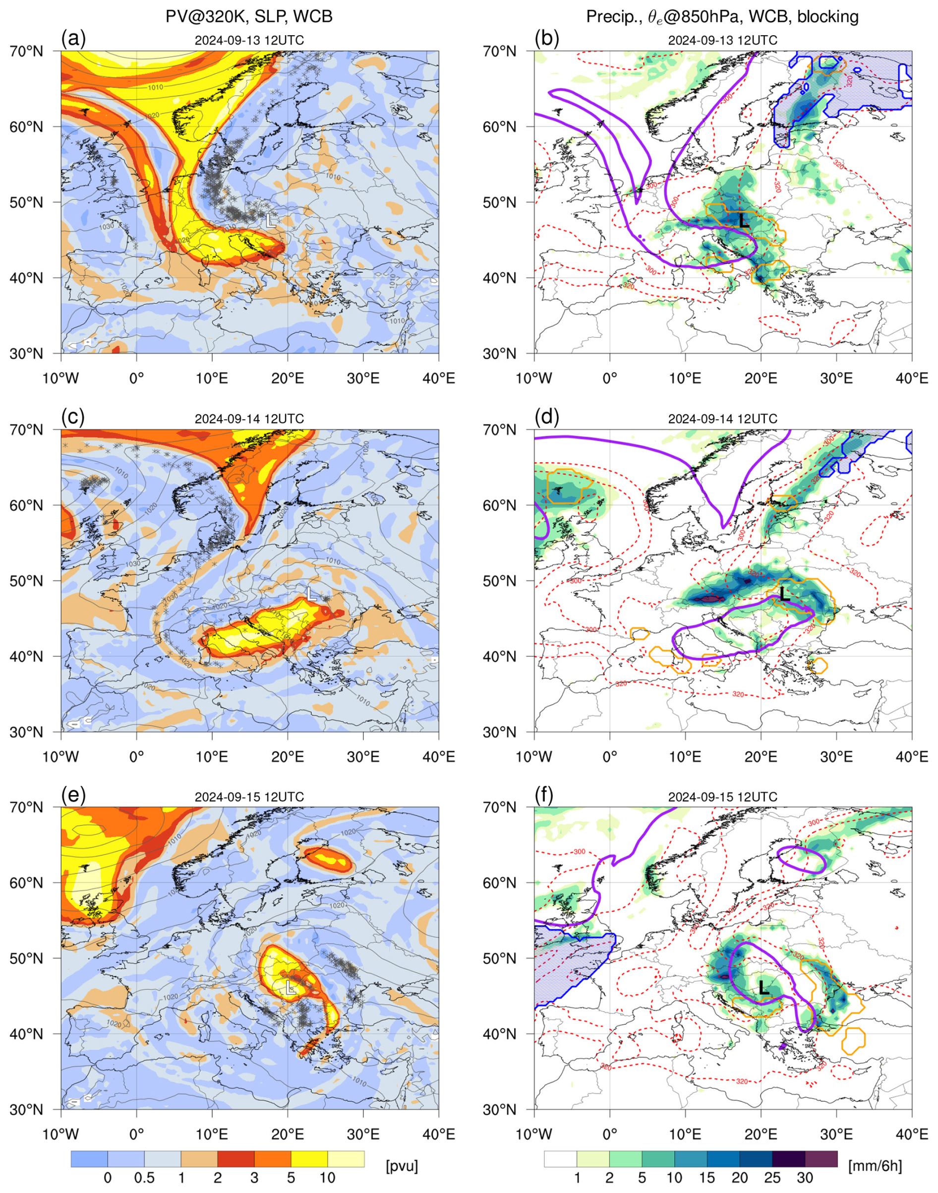 The surface cyclone associated with Boris originated close to the Gulf of Genoa between 11 and 12 September (Fig. 3a), at the southern edge of a broad upper-level PV streamer located over central Europe. As the streamer proceeded eastward and started to break cyclonically, the center of the cyclone was stirred across Italy towards the Carpathians (Fig. 3b): we verified that such a track fulfills the definition of Vb cyclone introduced by Hofstätter and Chimani (2012) and Messmer et al. (2015). We remind here that the track shown in Fig. 3a, c, e results from an ad-hoc, manually performed tracking of Boris' SLP minimum and geopotential at 850 hPa. The automated tracking algorithm, on the other hand, split Boris' track between two separate lows despite visual evidence of a single, broad, stationary cyclone (not shown).
