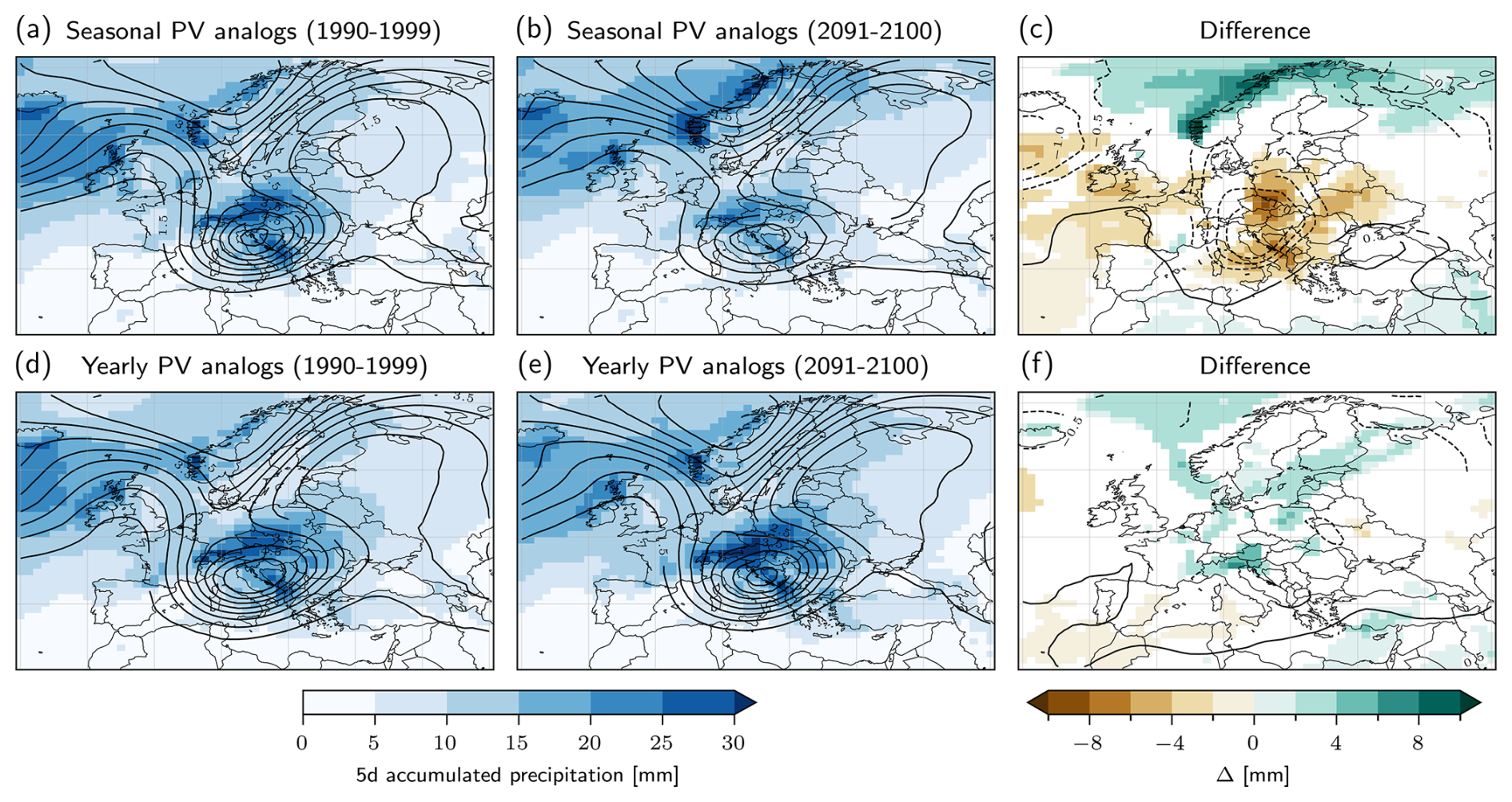 Using large-scale circulation analogs in the observational record in the context of the ClimaMeter rapid attribution framework, Faranda et al. (2024) compared analogs of Boris in the present climate (obtained from analogs in the period 2001–2023) and in a counterfactual climate (obtained from analogs in the period 1979–2001). They observed an increase in precipitation, and related it to a deepening of the associated surface cyclone in the present climate with respect to the future counterfactual. However, as discussed in Faranda et al. (2024), confidence in the results is partially limited by the relatively small number of analogs of Boris found in the reanalysis data set, a common issue when studying unusual extreme events. Performing analog-based studies of heavy precipitation events related to upper-level PV cutoffs is particularly challenging, as small differences in the PV distribution can result in notable shifts in the regions affected by heavy precipitation (as noticed by Fehlmann and Quadri, 2000; Fehlmann et al., 2000; Schlemmer et al., 2010; Thompson et al., 2024). This observation further underscores the importance of correctly representing the dynamical setup of extreme precipitation events when performing detection and attribution studies, an aim that can be achieved through improved large-scale circulation analogs.