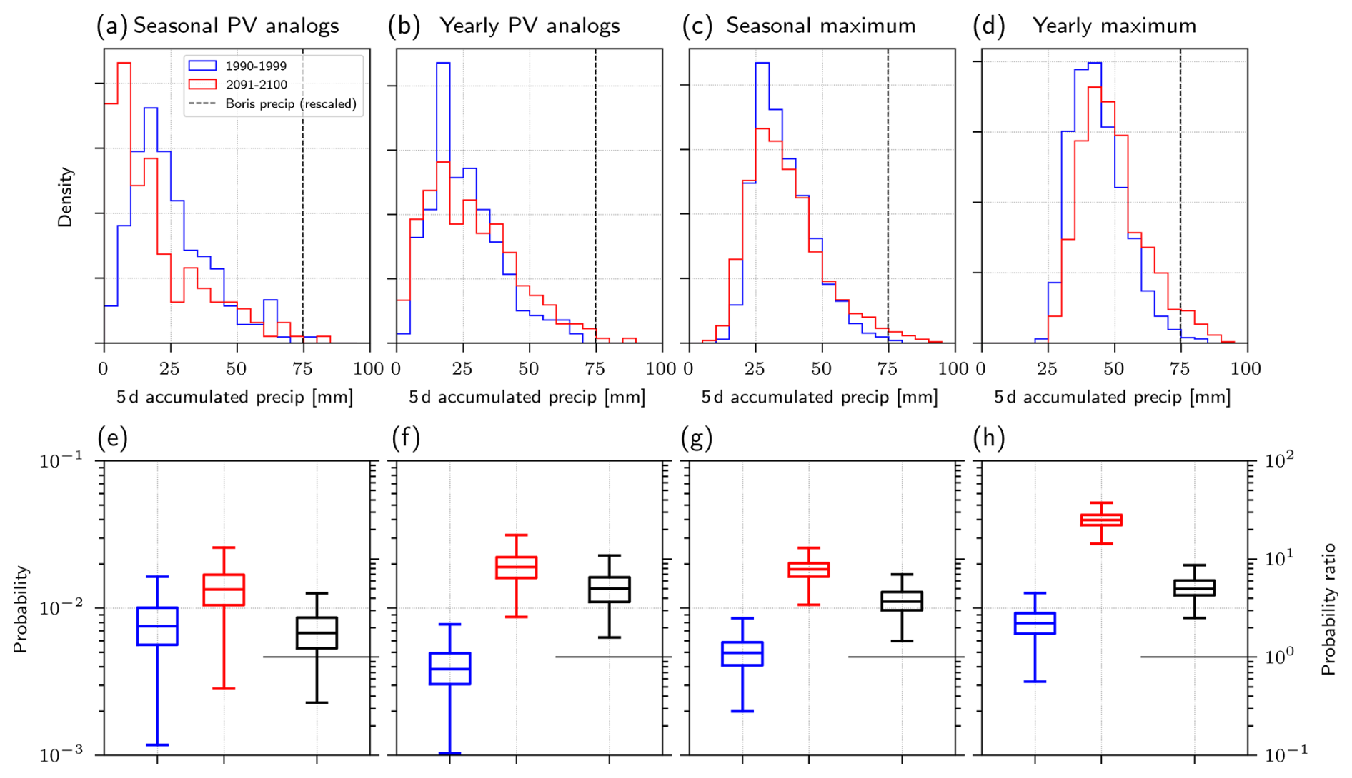 Figure 7Distribution of mean precipitation in the impacted region (47.2–51° N and 12–19.5° E) for analogs and maximum events. Distribution of spatial mean 5 d accumulated precipitation over the impacted region for the (a) seasonal and (b) yearly PV analogs and the maximum (c) seasonal and (d) yearly events in the periods 1990–1999 (blue) and 2091–2100 (red). The number of events vary for the PV analogs (see Sect. 2.2) but not for the seasonal and yearly maximum events (n=1050 in both periods). The corresponding precipitation in ERA5 (after rescaling via quantile mapping to the present CESM1 distribution) for the Storm Boris over the same region are shown with a vertical dashed line. Probability to reach the rescaled ERA5 precipitation over the impacted region for the (e) seasonal and (f) yearly PV analogs and the maximum (g) seasonal and (h) yearly events in the periods 1990–1999 (blue) and 2091–2100 (red). Probabilities are estimated using a Gamma distribution for PV analogs and a GEV distribution for maximum events. The boxplots show the distribution of estimated probabilities over bootstrapped samples (see text). The black boxplots show the corresponding distribution of probability ratios.