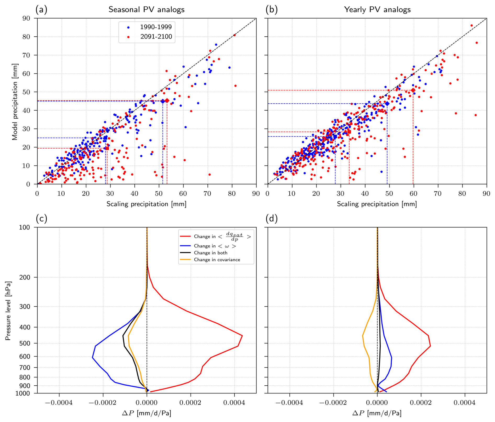 As detailed in Sect. 2.4, we then attribute the change in scaling precipitation at each pressure level to thermodynamical changes due to the Clausius–Clapeyron relationship (change in ), dynamical changes due to upward wind speed (change in Δω), change in both of those quantities at the same time and change in their covariance (Fig. 8c, d). For both types of analogs the thermodynamical response is largely positive. It is larger for seasonal analogs because of a larger warming when conditioning on the same season (+7.2 vs. +3.6 K at 2 m) due to a seasonal shift in the yearly PV analogs (Fig. S13c, f). On the contrary, the dynamical contribution is negative for seasonal PV analogs – meaning that the mean vertical velocity decreases between the two periods – while slightly positive for yearly PV analogs. The change in both quantities at the same time is negative for seasonal PV analogs and null for yearly PV analogs, and its amplitude is smaller than the two other terms as expected. Finally, the change in the covariance is slightly negative for both seasonal and yearly analogs, meaning that atmospheric situations with updrafts happen less often in situations with positive anomalies of in the future. As a consequence, the change in the dynamical contribution of precipitation compensate the strong thermodynamical signal in the future which leads to minimal changes in mean scaling precipitation for seasonal PV analogs (Fig. 8a). For yearly analogs – for which by definition the dynamics is closer to the one of the event – the dynamics contribution is small and the response is dominated by the thermodynamical signal, resulting in the positive increase in both scaling and actual precipitation seen in Fig. 8b.