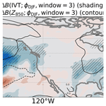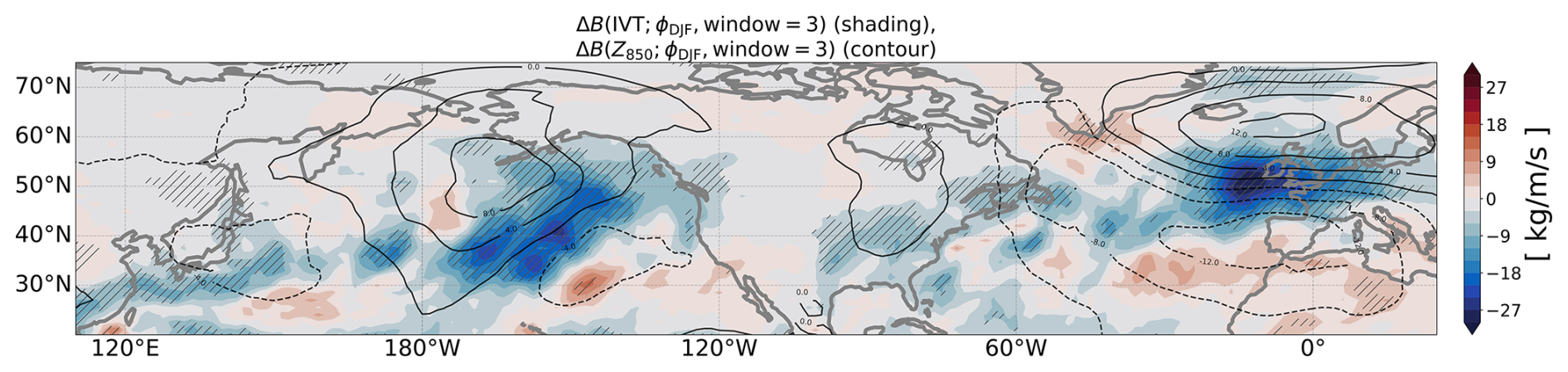 Here, we define IVT=g-1200hPa1000hPaqvdp. Figure 2 shows the bias change ΔB of the IVT (shading) and Z850 (contours) for pentad 3. Over the North Pacific, the IVT is reduced along the southeastern side of the weakened Aleutian Low toward the Gulf of Alaska. Over the North Atlantic, the reduced IVT lies between the weakened Icelandic Low and the Atlantic Subtropical High, with a more zonal orientation toward western Europe.