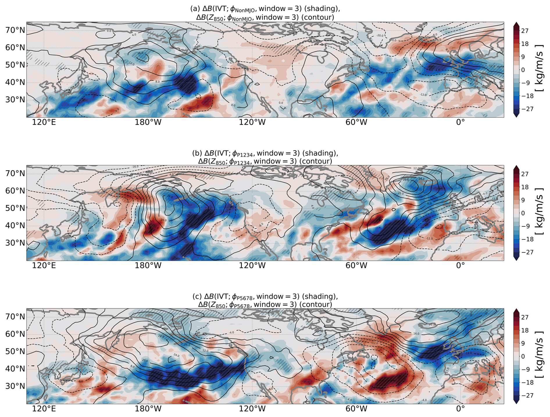 The shape of the IVT bias depends on the MJO. Figure 3a–c show the composite bias changes of IVT (shading) and Z850 (contour) grouped by MJO-inactive, MJO phases 1–4, and MJO phases 5–8 as defined in Sect. 2.4. The weakened Aleutian Low remains in the middle of the North Pacific, such that the weakened Pacific IVT is consistently oriented southwest–northeast. In contrast, the Icelandic Low and Atlantic Subtropical High weakening is spatially more variable, such that the Atlantic IVT pattern is less consistent across MJO groups.