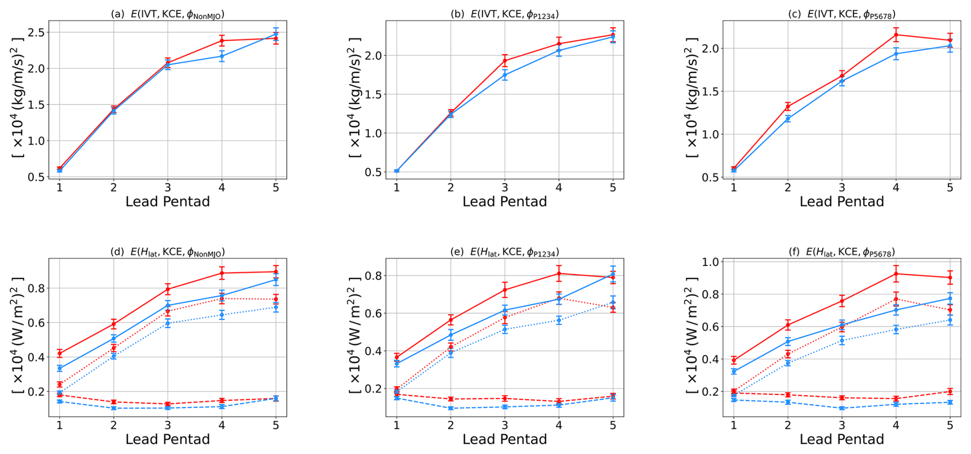 Figure 4Bias variance E analysis of quantities as a function of pentads 1–5 computed from Global Ensemble Prediction System (GEPS) version 5 (GEPS5, red) to GEPS version 6 (GEPS6, blue) over the Kuroshio Current Extension (KCE) region for Non-MJO group (a, d), P1234 group (b, e), and P5678 group (c, f). (a–c) Integrated vapor transport (IVT). (d–f) Latent heat flux (Hlat). For Hlat (d–f), the decomposition of E into mean (E, dashed) and patterned (Ẽ, dotted) variances is added. The whiskers represent the standard error.