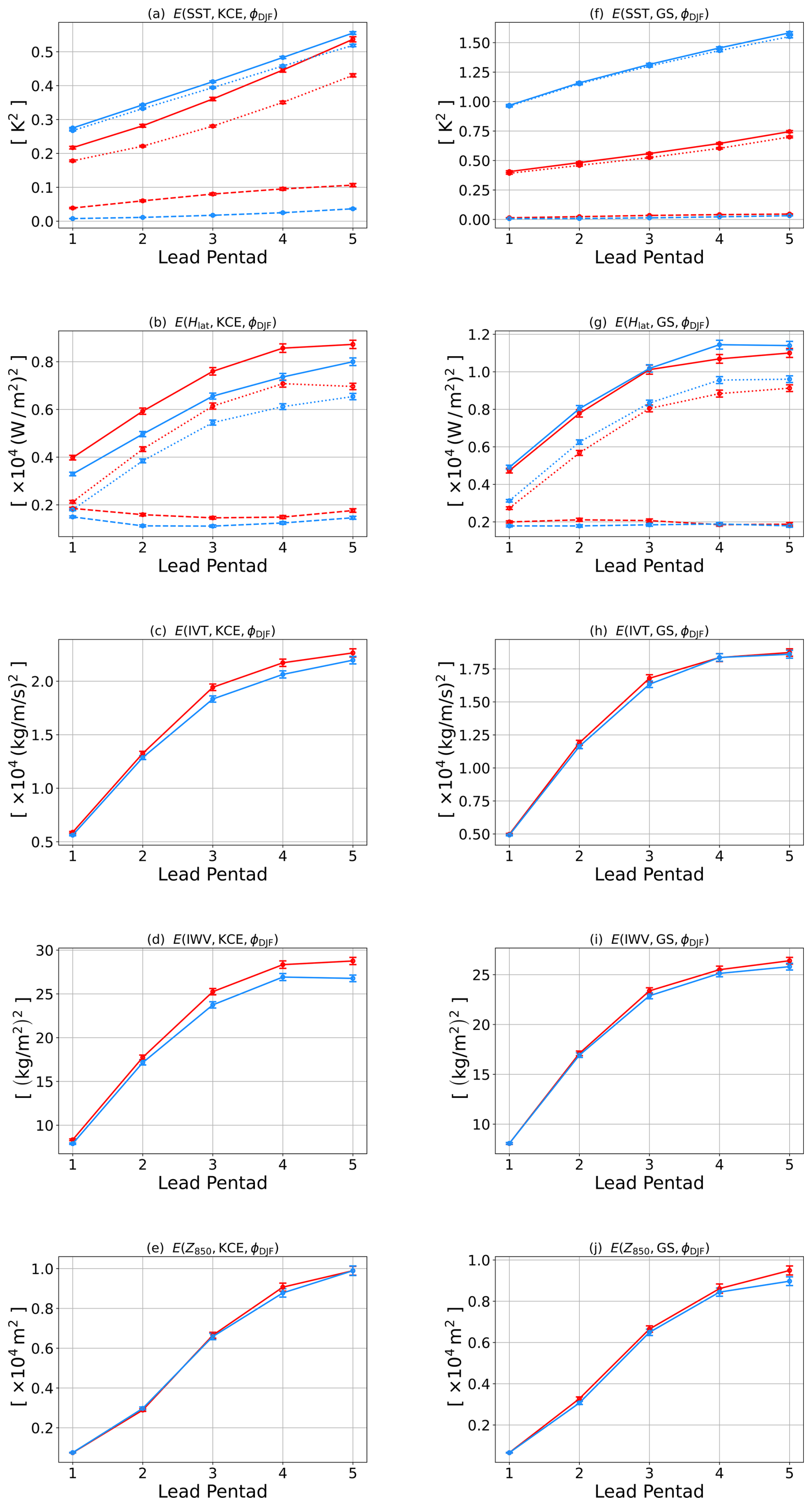 Figure 5Bias variance E analysis of quantities as a function of pentads 1–5 computed from Global Ensemble Prediction System (GEPS) version 5 (GEPS5, red) to GEPS version 6 (GEPS6, blue) during December–January–February of the first three pentads in hindcast years 1998–2017. (a, f) Sea surface temperature (SST). (b, g) Latent heat flux (Hlat. (c, h) Integrated vapor transport (IVT). (d, i) Integrated water vapor (IWV). (e, j) 850 hPa geopotential height Z850. For SST (a, f) and Hlat (b, g), the decomposition of E into mean (E, dashed) and patterned (Ẽ, dotted) variances are added. Panels (a)(e) are for the Kuroshio Current Extension (KCE) region, and panels (f)(j) are for Gulf Stream (GS) region. The whiskers represent the standard error.