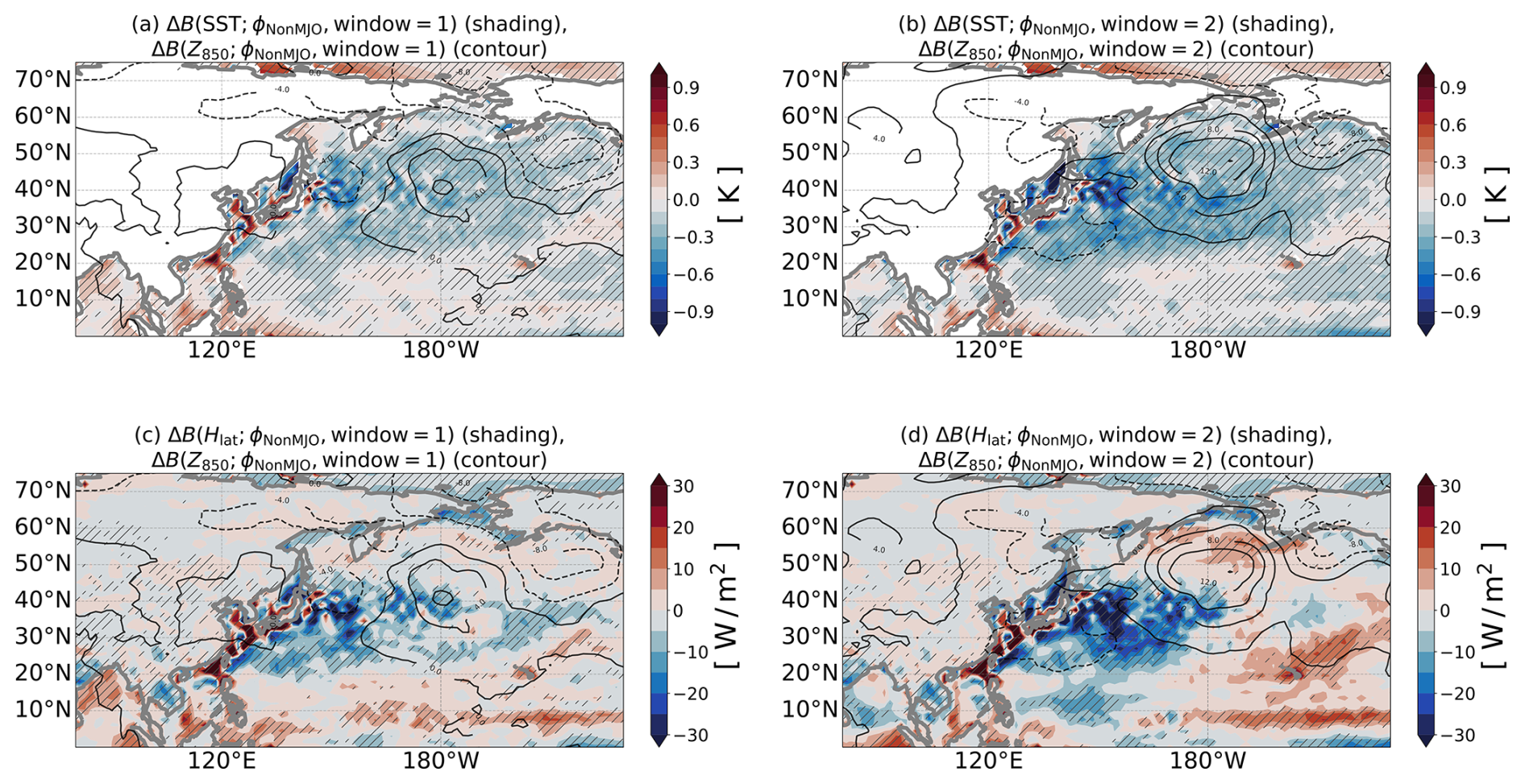 To remove the MJO influence, we examine the response of Z850 and latent heat fluxes Hlat composited with non-MJO groups. In the absence of MJO, the Aleutian Low weakens in GEPS6 relative to GEPS5 during pentads 1–2 (contours in Fig. 6a–d). The SST bias change between 30–60° N is 0.2 K in the first pentad due to difference in SST initialization strategy, and potential issues in model resolution (see Sect. 4). This results in a reduction in Hlat (Fig. 6c shading), causing a weaker cyclogenesis such that the Z850 is positively biased.
