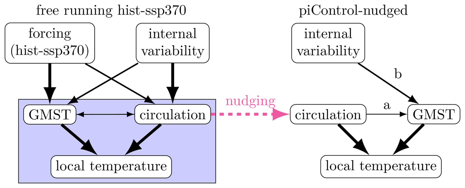 In a free-running, fully coupled climate simulation, local and regional temperatures are shaped by both thermodynamic forcing, here represented by global mean surface temperature (GMST) as a proxy for the large-scale thermodynamic background conditions, and atmospheric circulation variability, as well as their interactions (e.g., Deser et al., 2016, Fig. 1). Statistical dynamical adjustment methods seek to separate these influences, but their skill is challenging to evaluate within a coupled system. To address this, we use “piControl-nudged” simulations as benchmarks in which circulation varies while thermodynamic forcing is fixed at pre-industrial levels. This design allows us to isolate and evaluate the circulation contribution independently of thermodynamic trends. Conceptually (Fig. 1), circulation variability is “inherited” from the parent simulation and is expected to dominate local and regional temperature responses. This inherited variability includes both internal fluctuations and possible forced circulation changes. Atmospheric circulation can affect GMST (arrow a in Fig. 1). Additionally, some internal variability unrelated to atmospheric circulation may remain, such as ocean-driven GMST fluctuations (arrow b in Fig. 1). Note that the decomposition into “thermodynamic” and “circulation-induced” changes is a simplification that overlooks important mechanisms for local temperatures. In Sect. 4, we discuss the implications of this simplification in more detail.