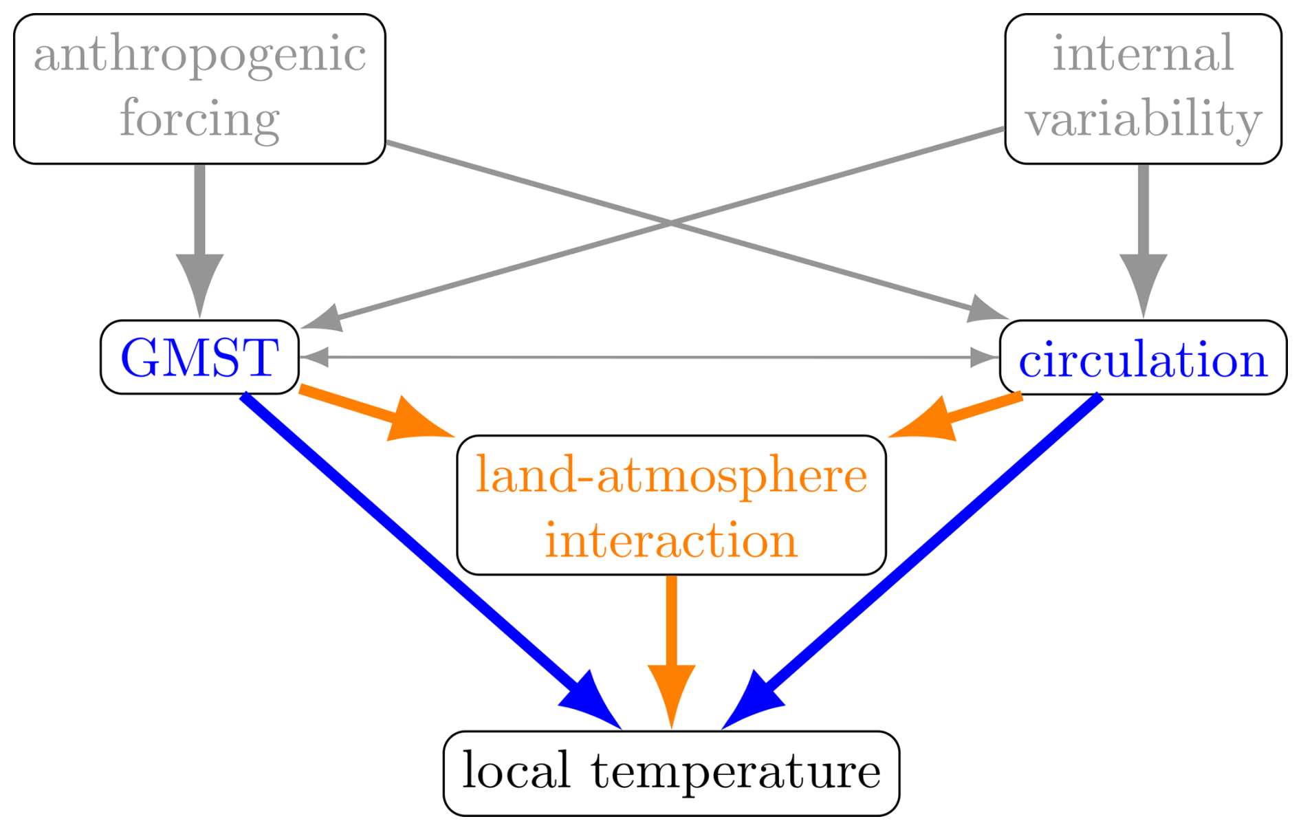 Figure 5Conceptual illustration of causal relationships influencing local temperatures in a forced climate as in Fig. 1 but with an additional driver of local temperature. In this study we aim at decomposing the influence on local temperature into thermodynamic (GMST) and circulation induced contributions (in blue). Land–atmosphere interactions is a driver we do not explicitly model (in orange).