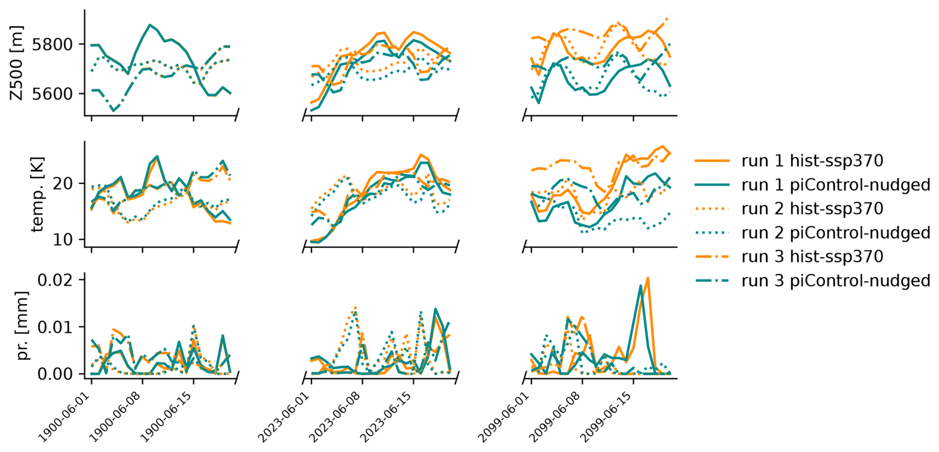 As expected, day-to-day variability in the nudged circulation run is closely related to its freely running counterpart from which the wind fields originated. As shown in Fig. A1, in the early period (left column of Fig. A1), geopotential height at 500 hPa and surface air temperature are nearly identical in the hist+ssp370 and the piControl-nudged run. In a warmer climate, day-to-day variability remains highly correlated, but geopotential height and surface air temperatures are uniformly shifted to higher values.